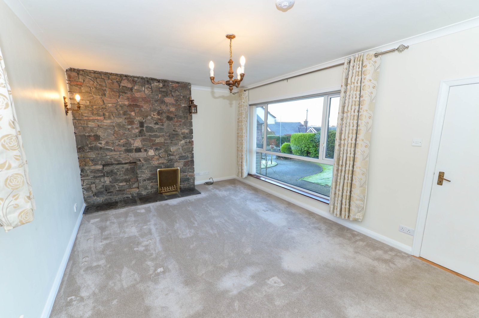 Modern spacious living room with feature stone wall with open fire and slate hearth. Cornice ceiling. Wall lighting. Picture window. Radiators.