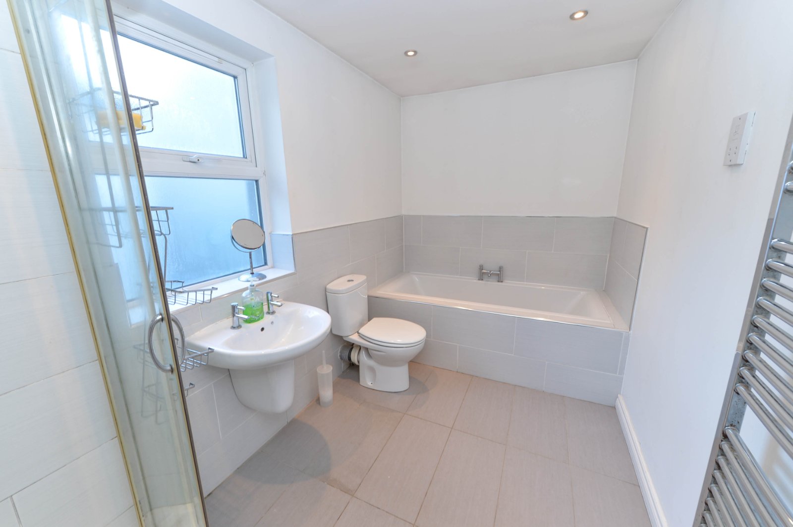 Panelled bath with mixer taps and tiled splash back, ceramic tiled floor, chrome heated towel rail, fully tiled built in shower cubicle with thermostatically controlled shower, semi pedestal wash hand basin with mixer taps, dual flush close couple WC, recessed spotlights.