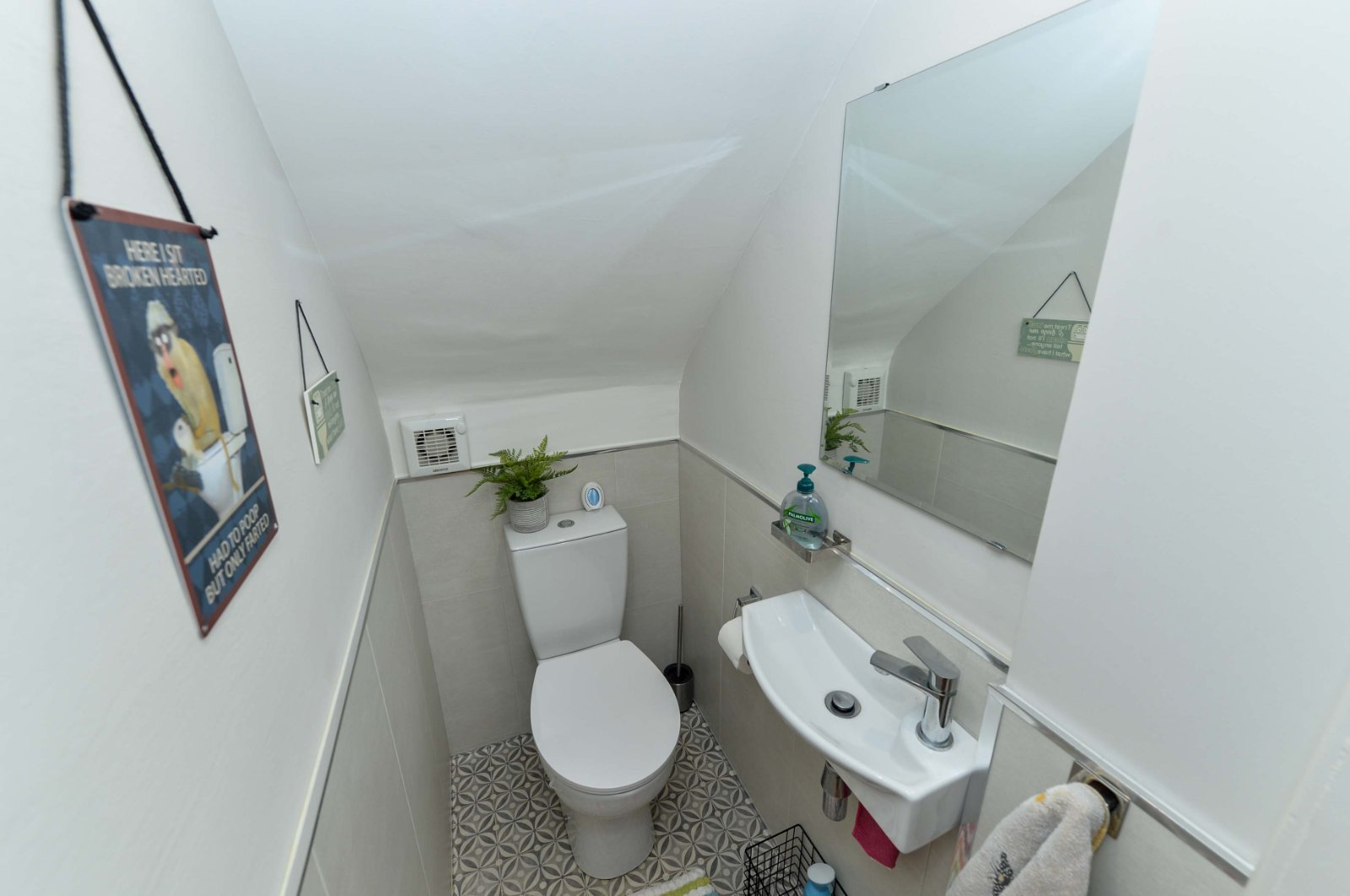 White modern suite comprising low flush closed coupled wc and wall mounted basin with chrome mixer tap. Wall and floor tiling. Recessed lighting. Radiator. Extractor fan.