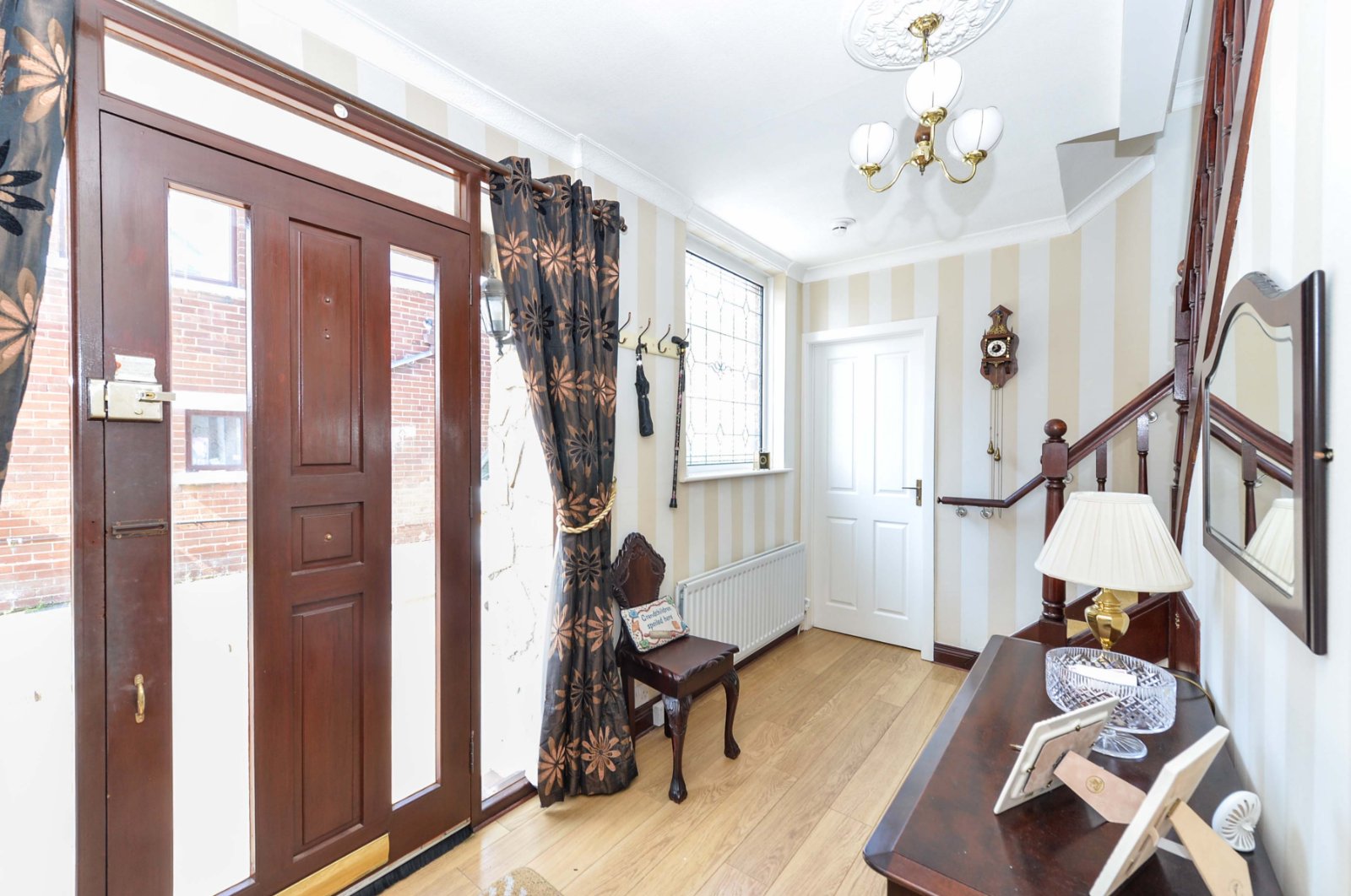 Welcoming stone entrance to spacious hall with return banister leading to first floor bedrooms. Cornice ceiling and ceiling rose. Laminate wood flooring.