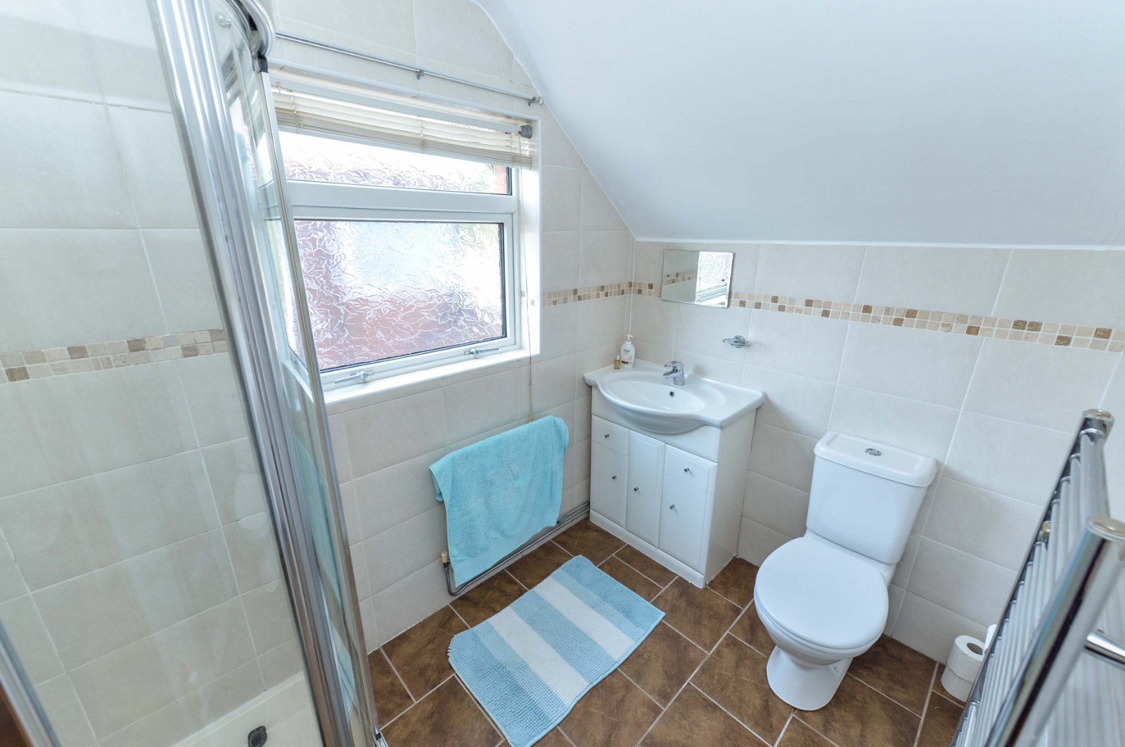 Comprising walk in shower enclosure and thermostatically controlled power shower. Wall mounted vanity unit with chrome mixer tap, low flush closed couple wc. Wall and floor tiling. Wall mounted chrome ladder style radiator. Recessed lighting. Wall and floor tiling.