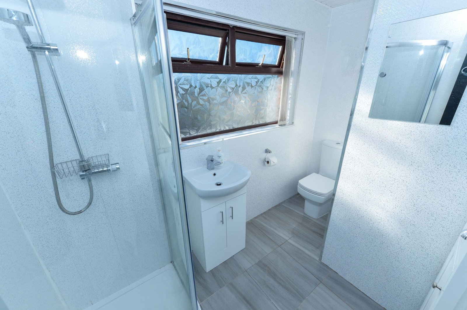 Comprising PVC panelled shower cubicle with thermostatically controlled shower unit with telephone hand shower and overhead drencher. Vanity unit with inset sink and chrome dual mixer tap. Dual flush w/c. PVC panelled walls and ceiling. Recessed spotlighting. Ceramic tiled flooring.