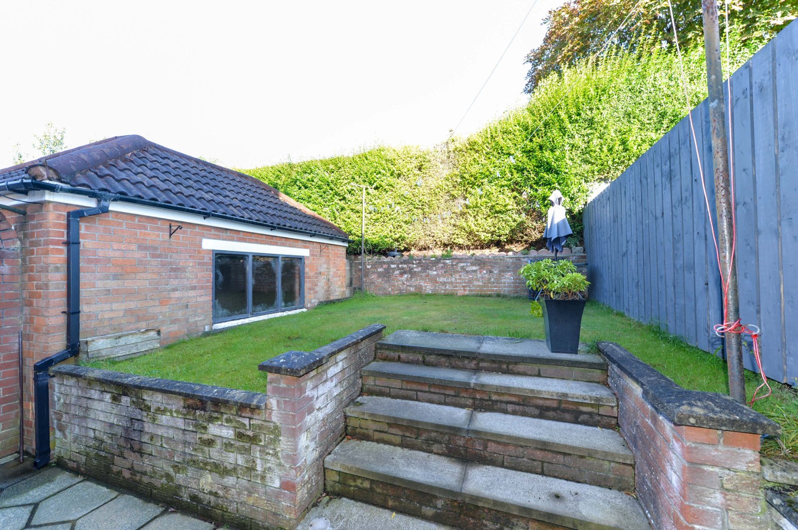 Well tended tiered garden to front in loose stones and shrubbery. Driveway car parking. Side access. Enclosed private south facing garden to rear bordered by fencing and hedging in lawn and paved patio area. Outside storage. Outside tap / light.