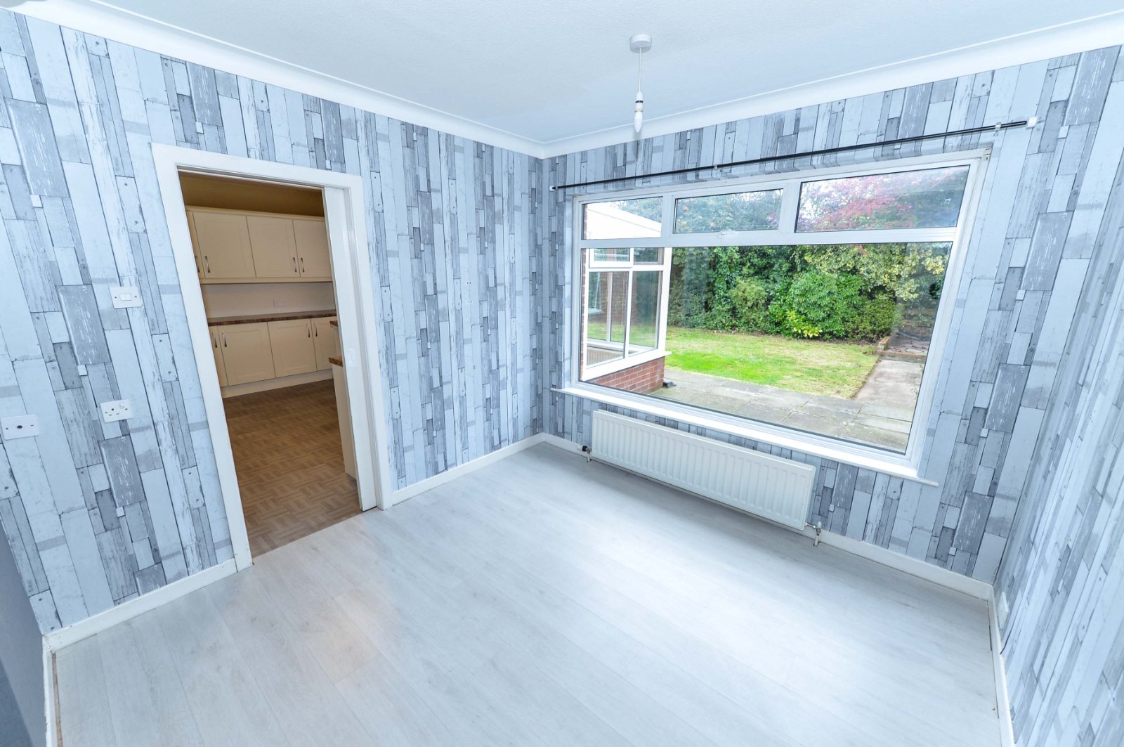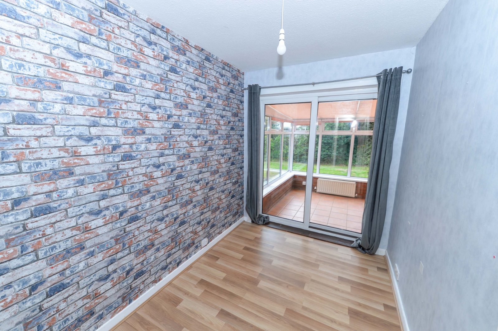 Laminated wooden flooring. uPVC sliding door to sun room.