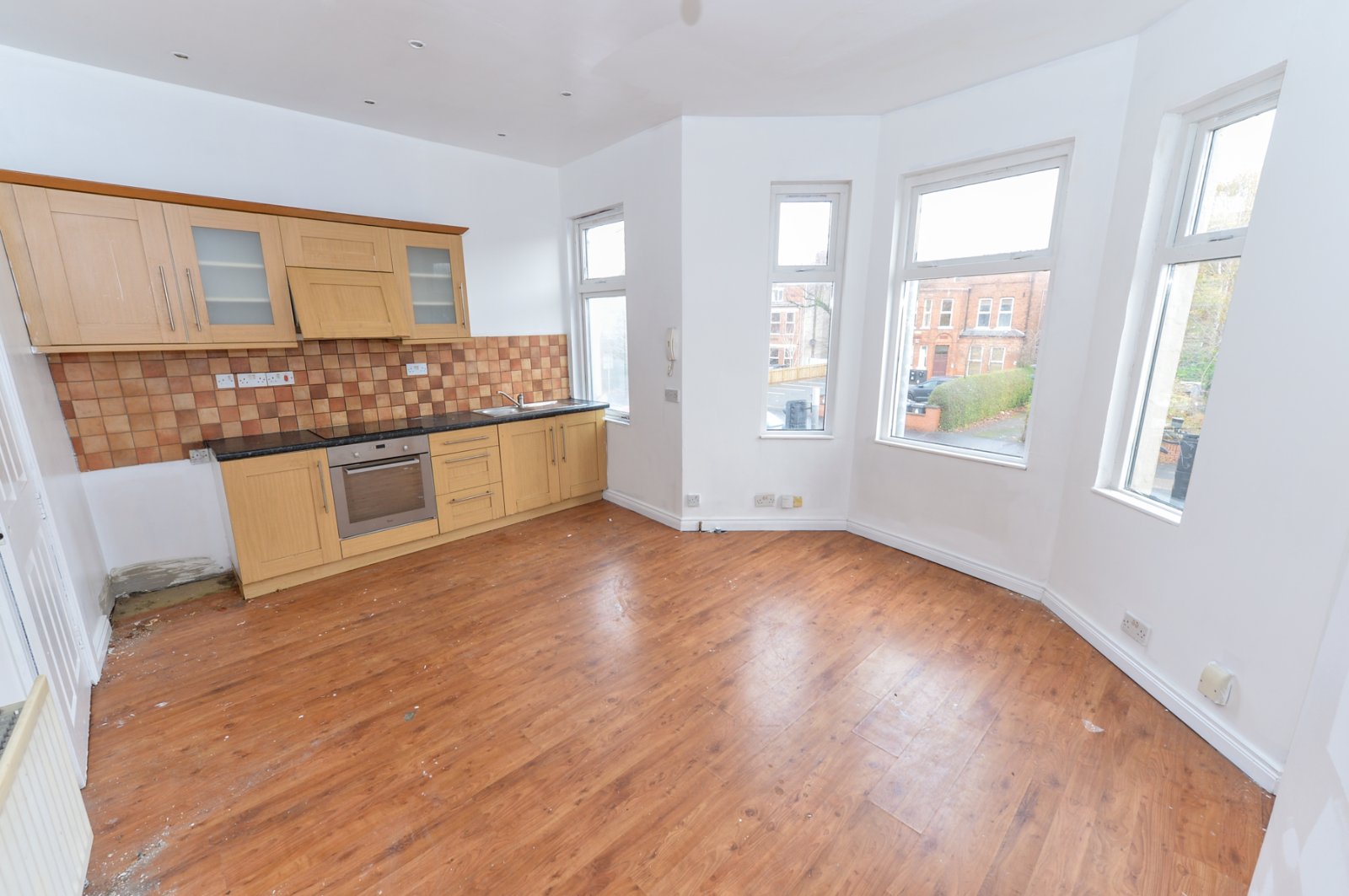 Bay window, laminate wooden floor, range of high and low level units, laminate work surfaces, tiled splash back, stainless steel built in oven and four ring ceramic hob, extractor fan, space for fridge freezer, recessed spotlights, dining area.