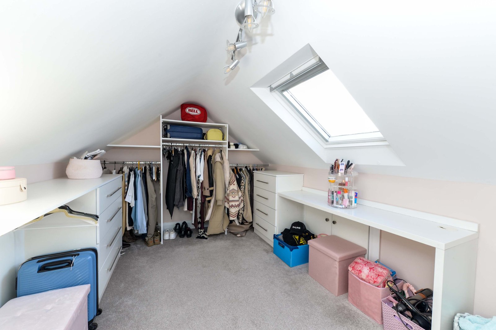 Velux window. Fitted storage. Spotlights.