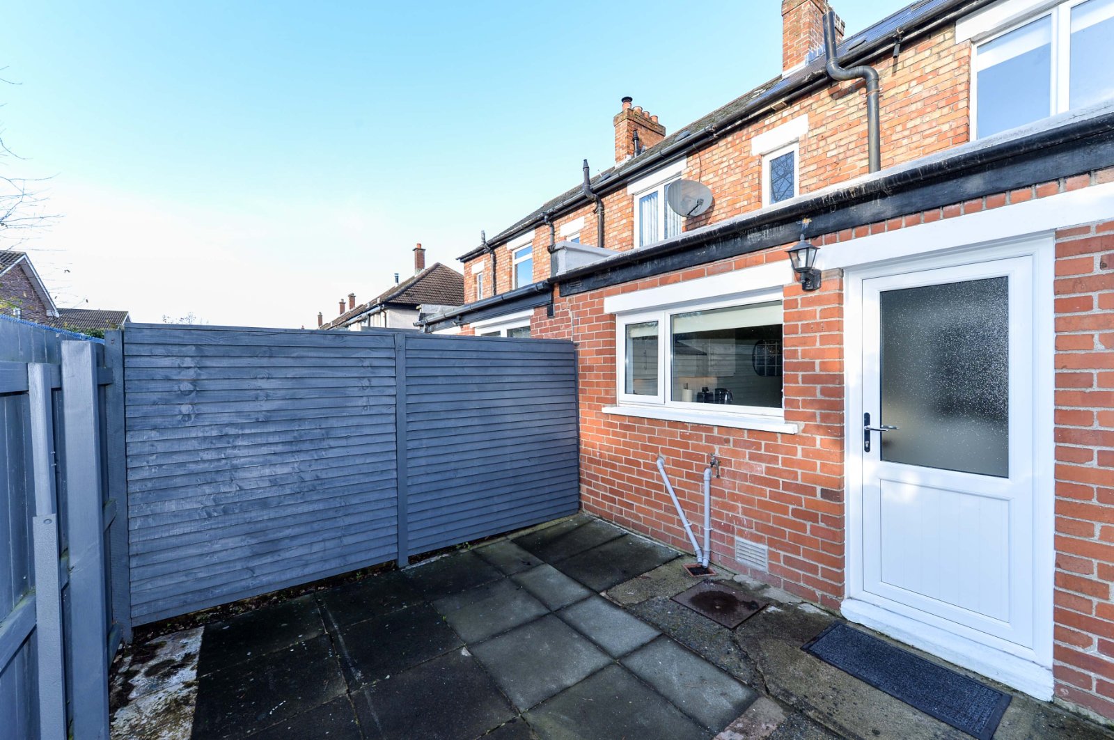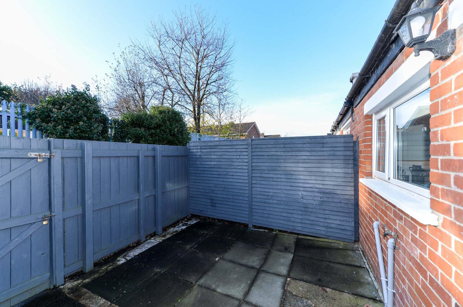 Front forecourt in paviour brick. External brick wall and gate.