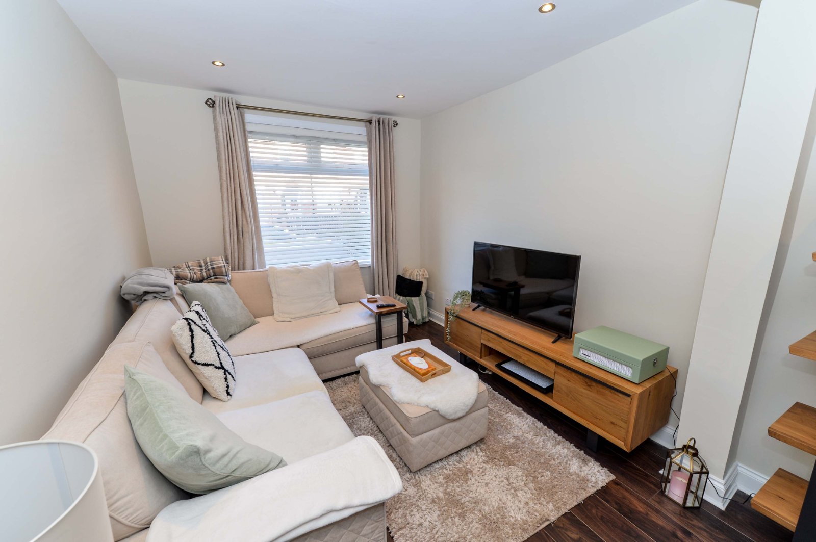 Laminate wood effect flooring. Recessed lighting. Radiator.