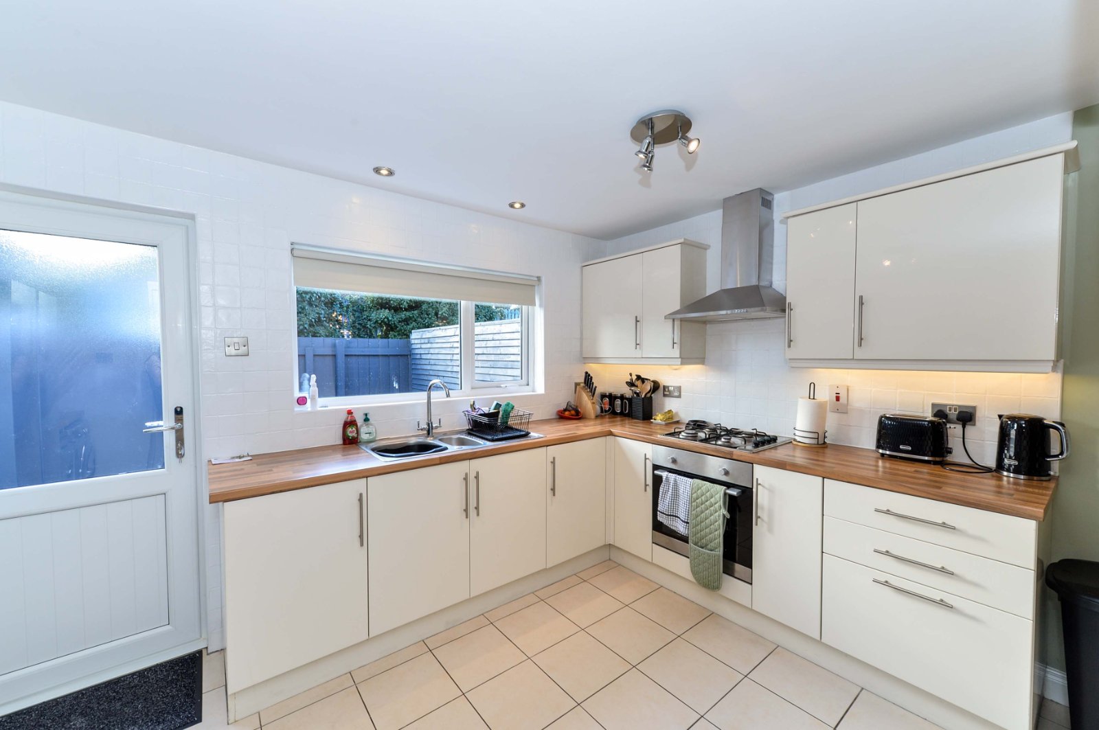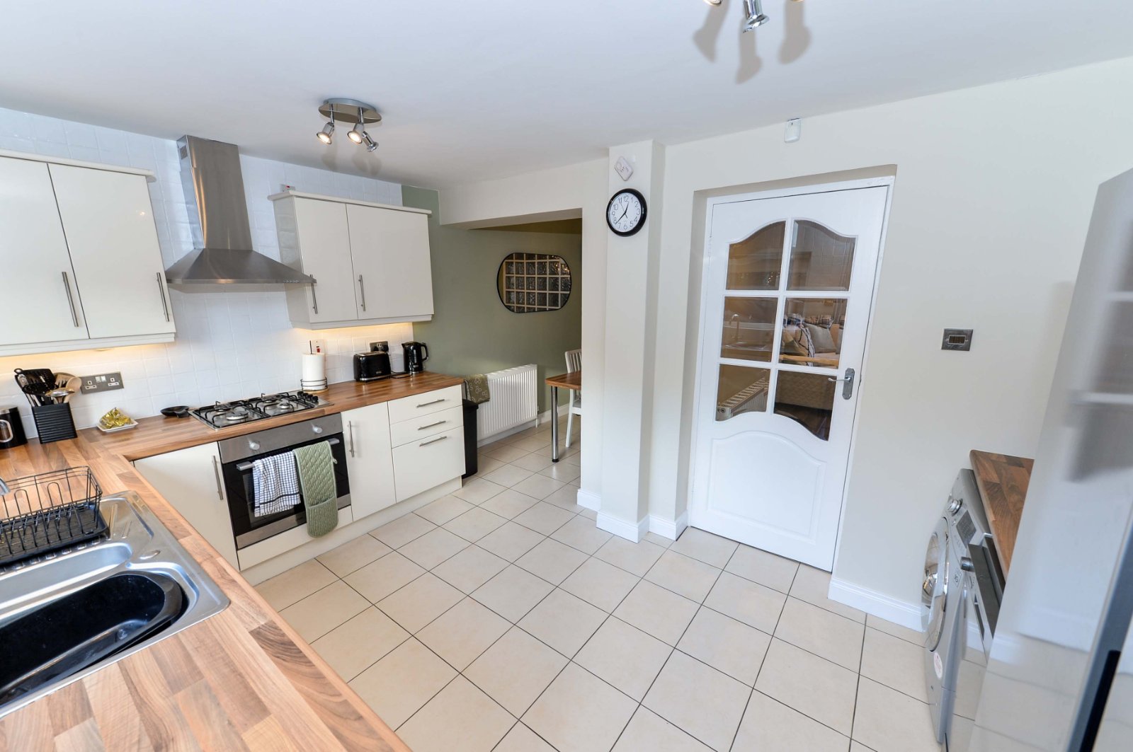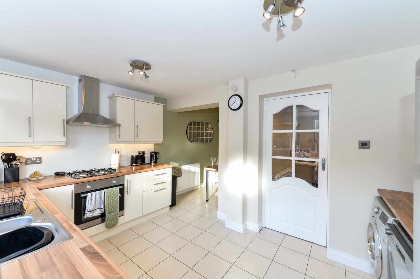 Double stainless steel sink unit with chrome dual mixer tap. Excellent range of high and low level units with stainless steel door furniture and wood effect work surfaces. Integrated four ring gas hob and built in stainless steel oven with stainless chimney extractor hood. Integrated fridge/freezer, dishwasher and washing machine. Shelving. Recessed spotlighting. Ceramic tiled flooring. Partly tiled walls. Dining area. Upvc door leading to private rear yard.