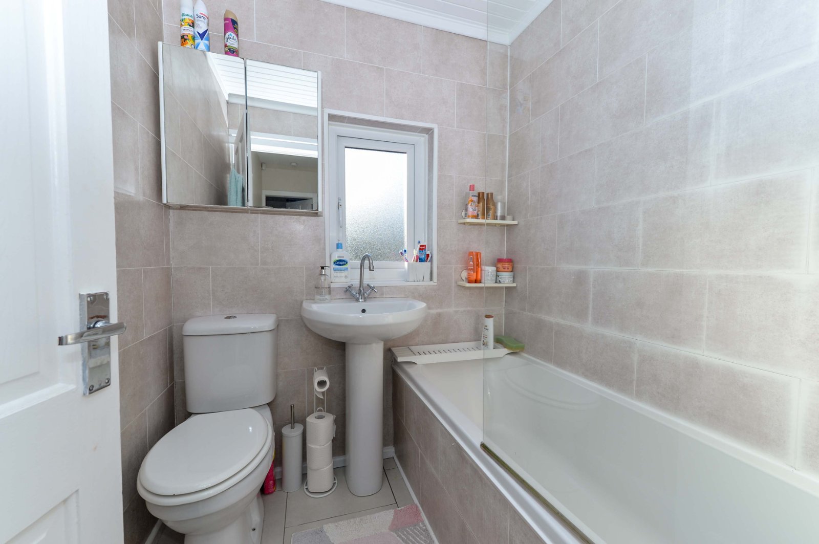 Comprising white suite with panelled bath with chrome dual mixer tap. Thermostatically controlled shower unit with telephone hand shower. Shower screen. Pedestal wash hand basin with chrome dual mixer tap. Dual flush w/c. PVC panelled walls. Pine ceiling. Extractor fan. Ceramic tiled flooring. Chrome heated towel rail.