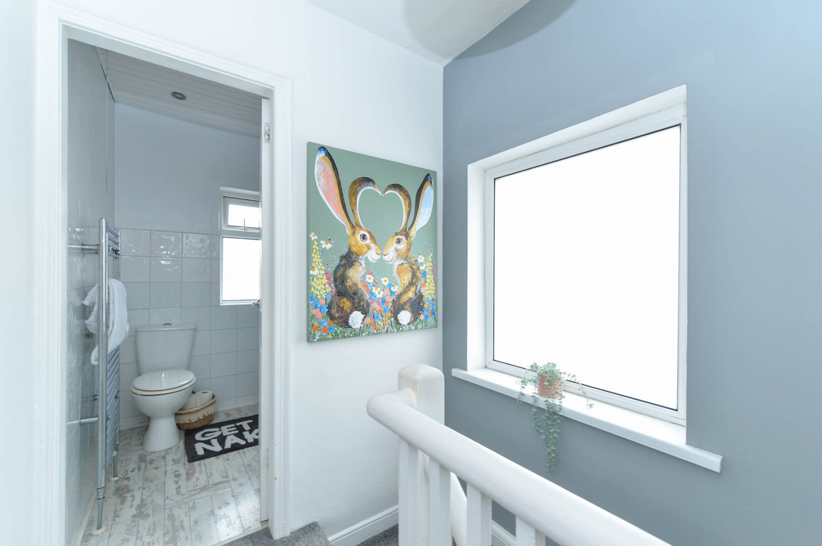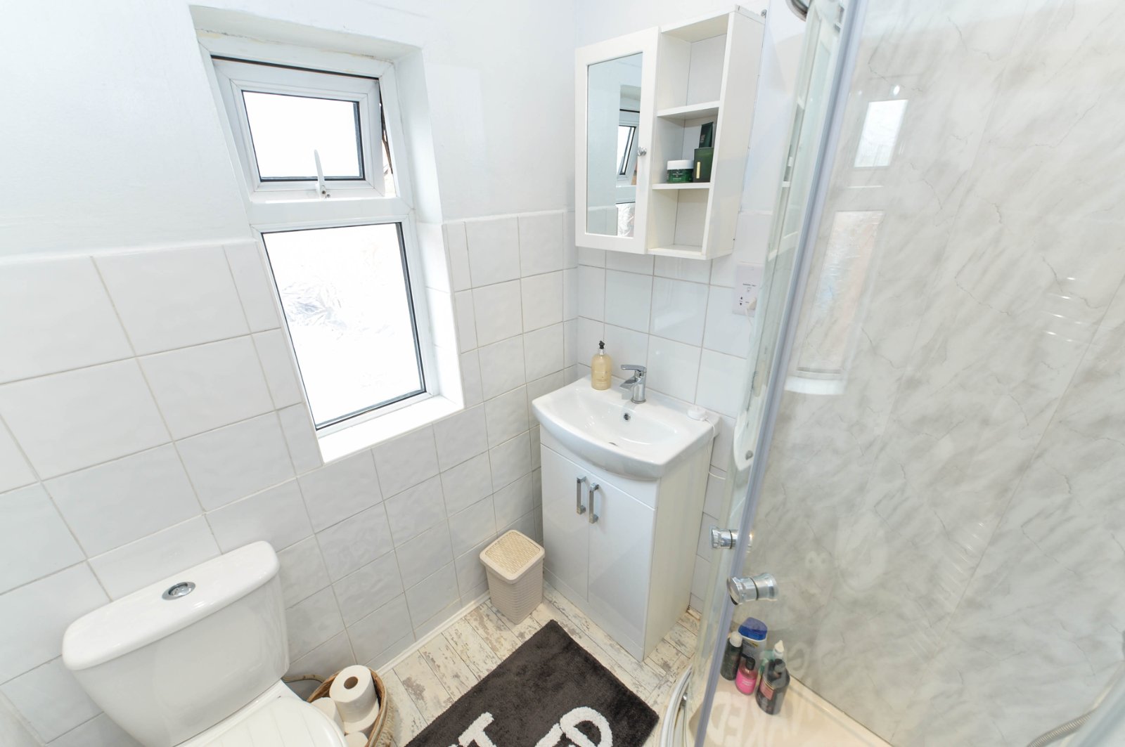 Comprising PVC panelled shower cubicle with thermostatically controlled shower unit with telephone hand shower. Vanity unit with inset sink and chrome dual mixer tap. Dual flush w/c. Partly tiled walls. Chrome heated towel rail. Recessed spotlighting. Access to roof space.