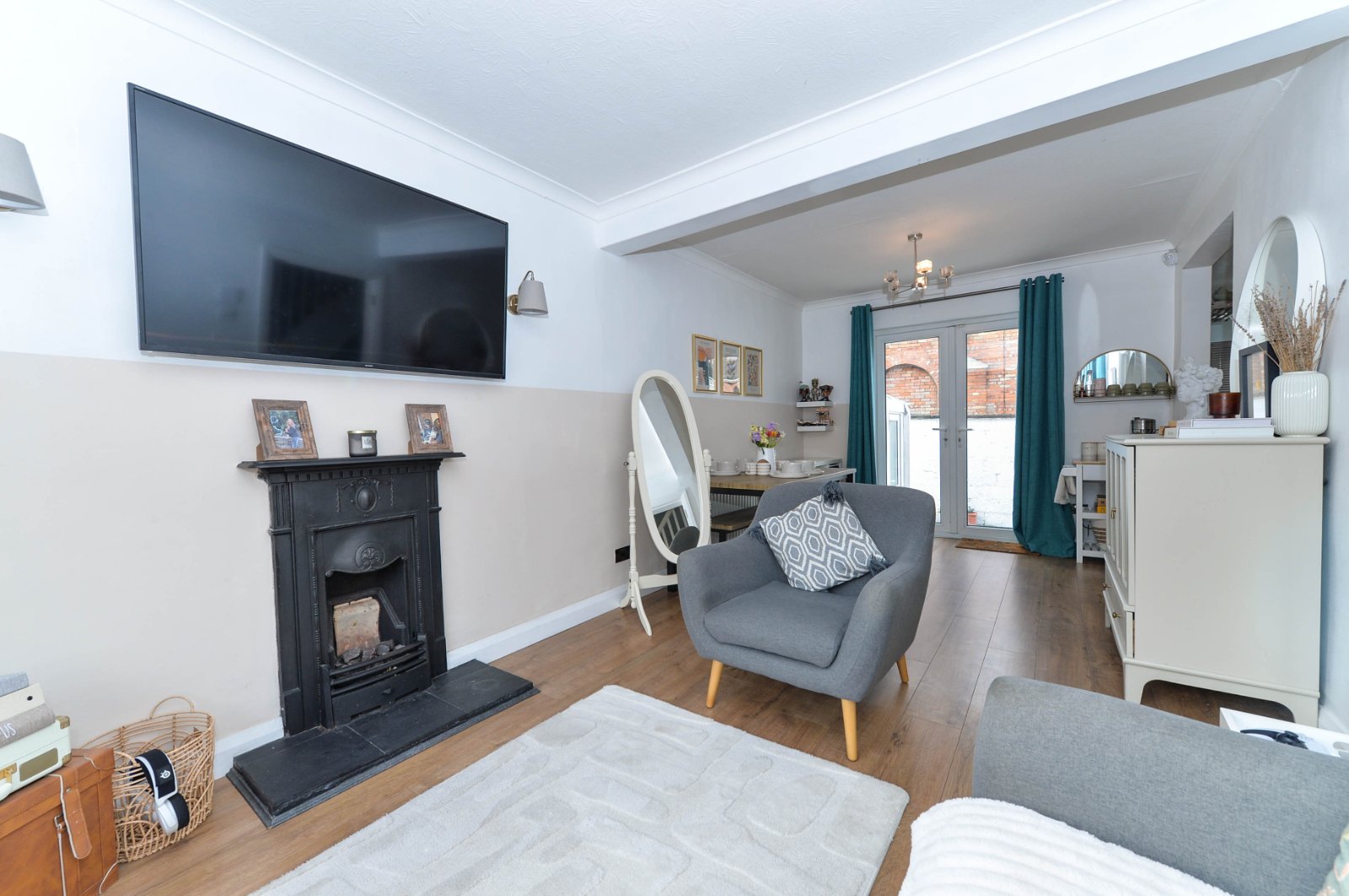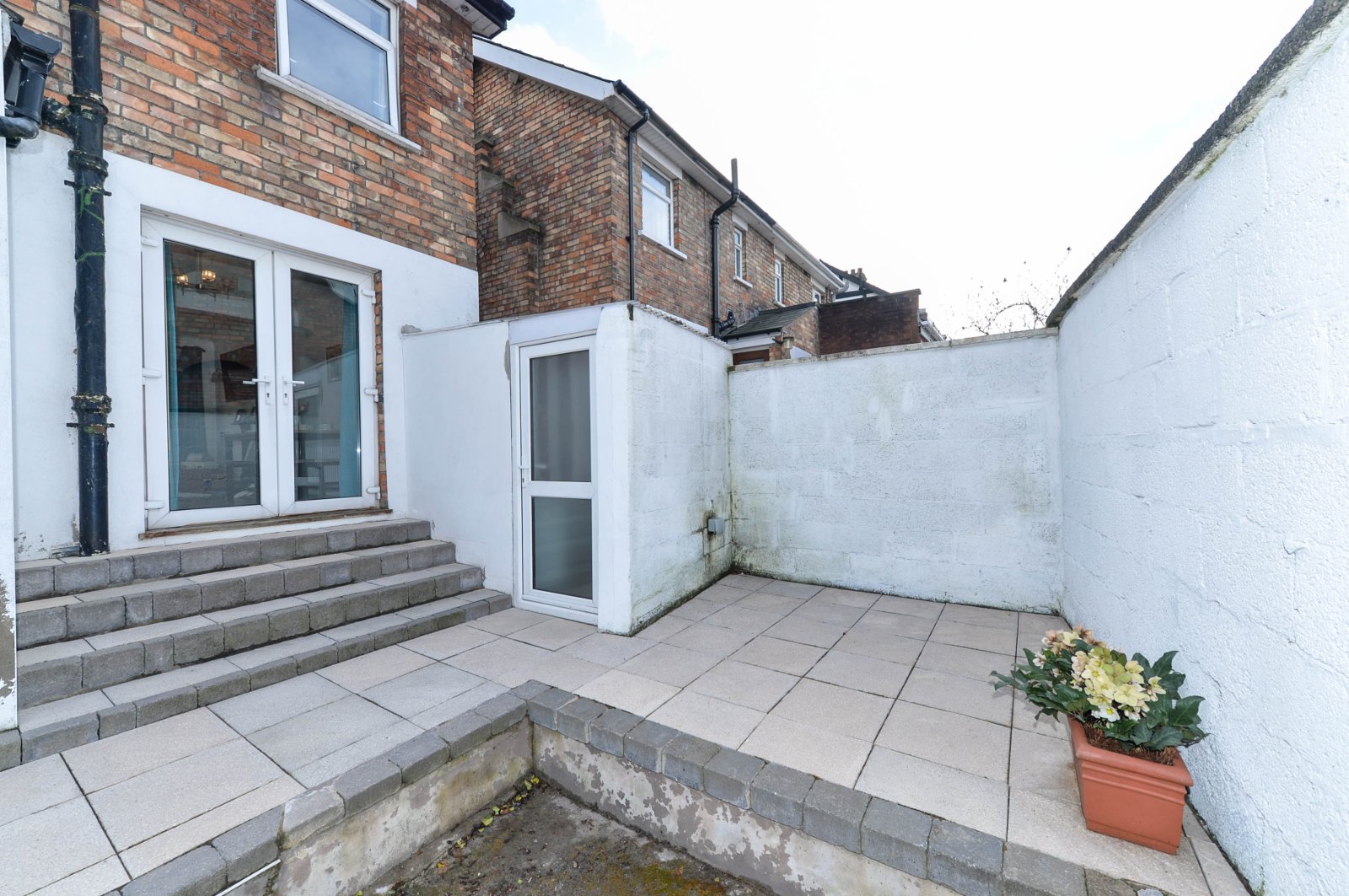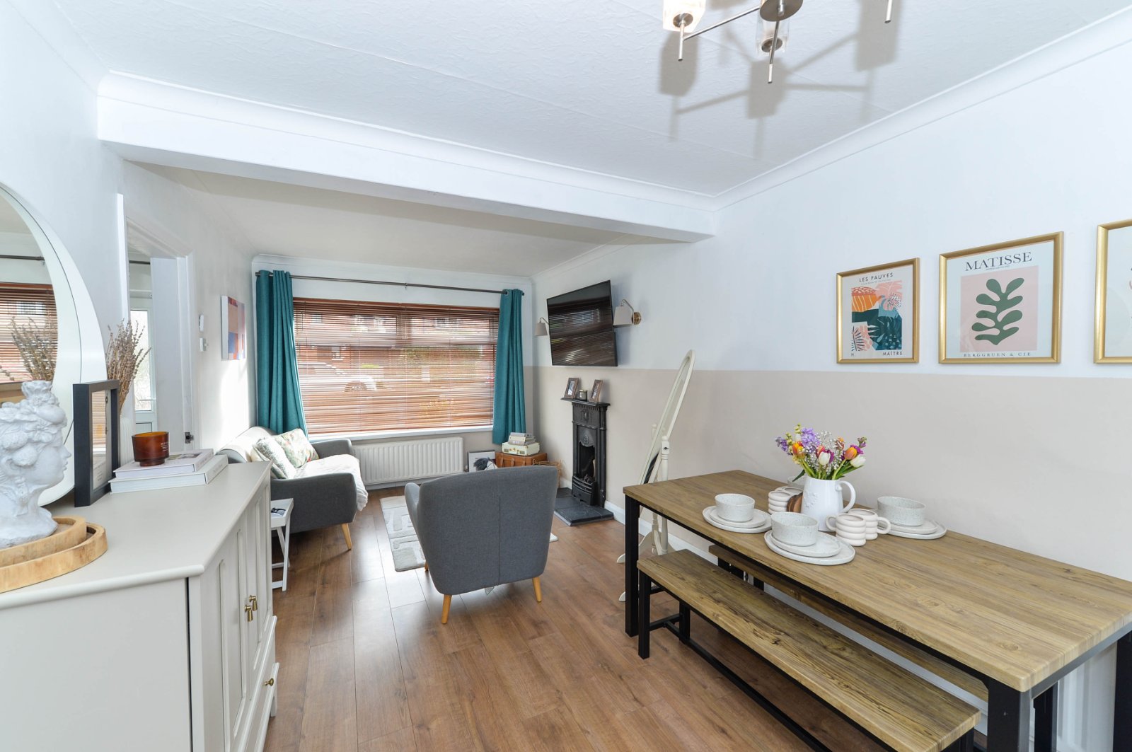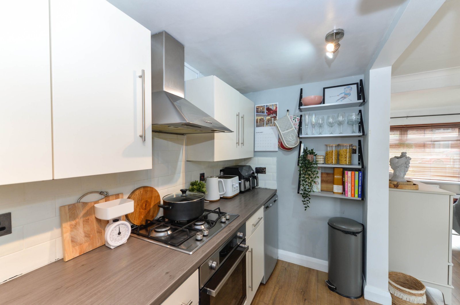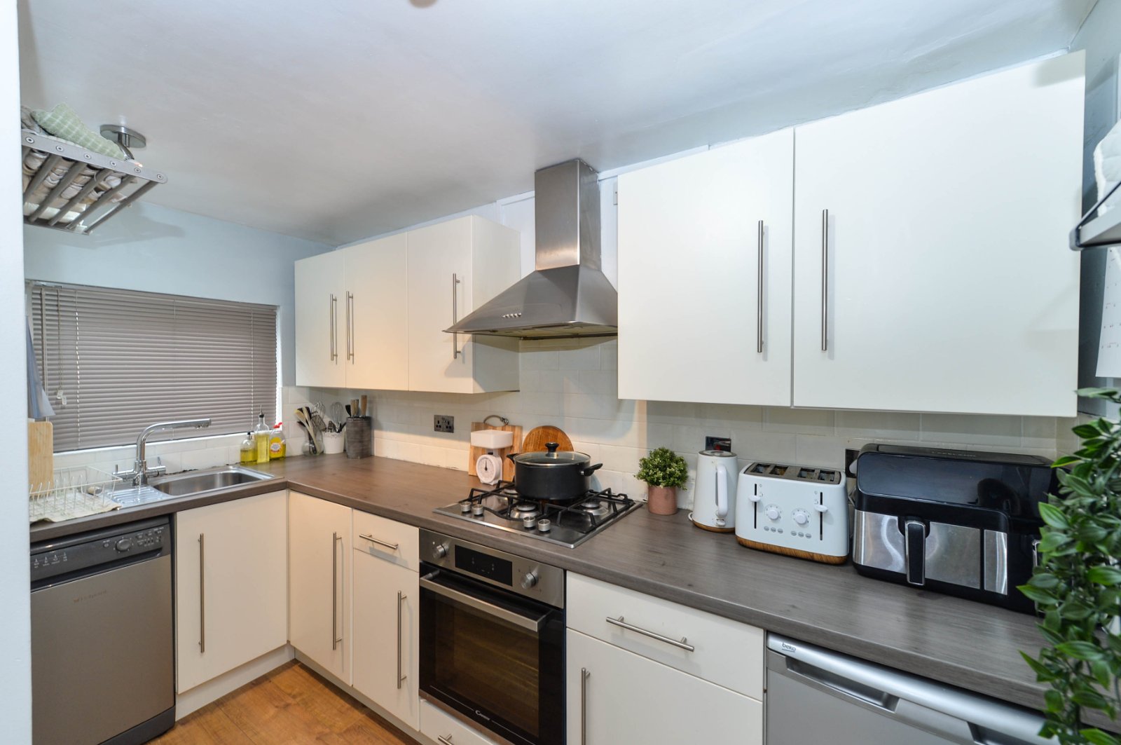 At widest points. One bowl sink unit with chrome dual mixer tap. Excellent range of high and low level units with stainless steel door furniture and formica work surfaces. Integrated four ring gas hob and built in oven with chimney extractor hood. Space for fridge. Plumbed for dishwasher. Partly tiled walls. Ample dining area. Original cast iron fireplace. uPVC French doors to enclosed rear garden.