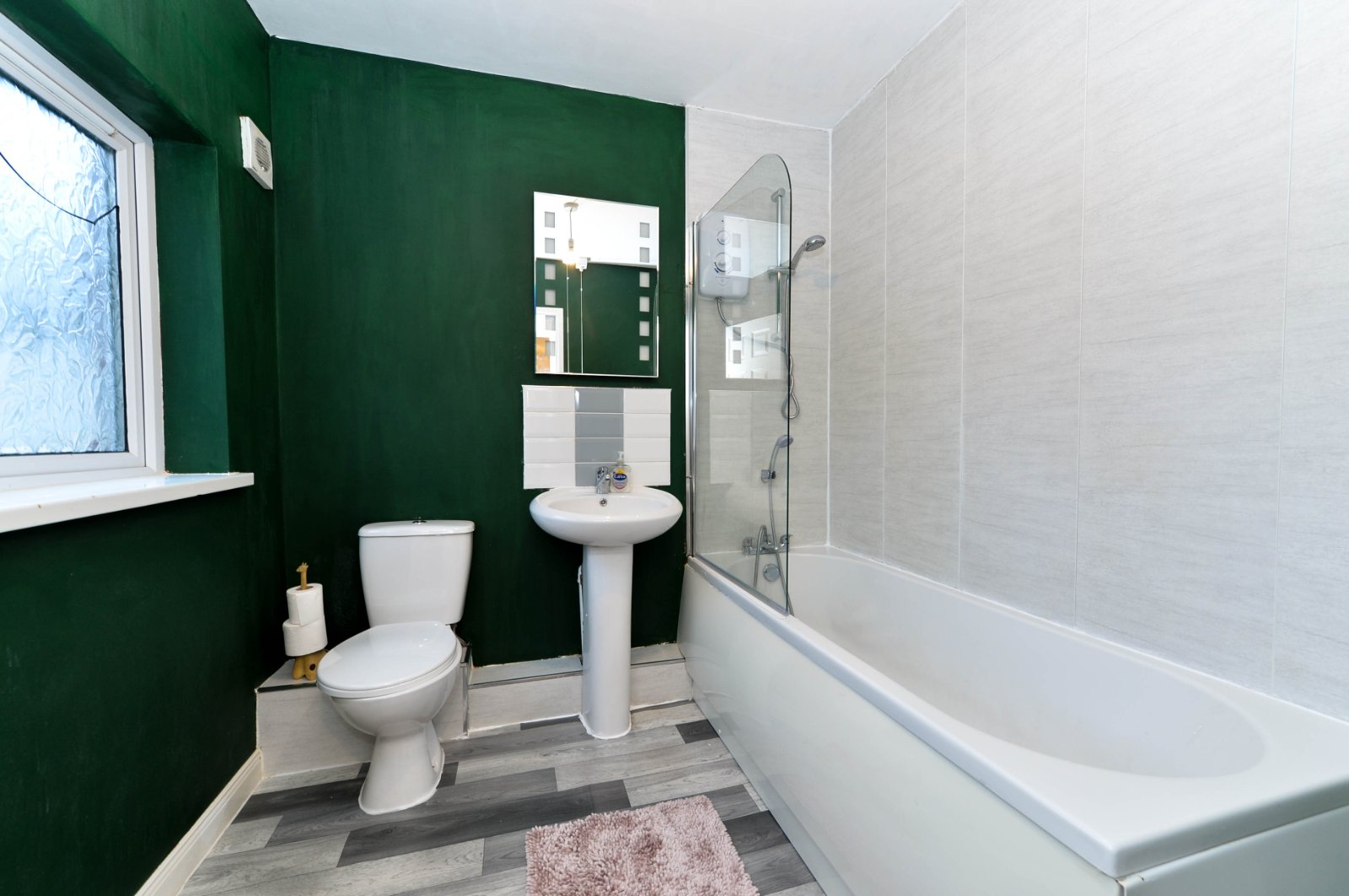 White suite, panelled bath with mixer taps and telephone hand shower, Mira electric shower, splash back, pedestal wash hand basin with mixer taps and tiled splash back, dual flush close coupled WC, chrome heated towel rail.