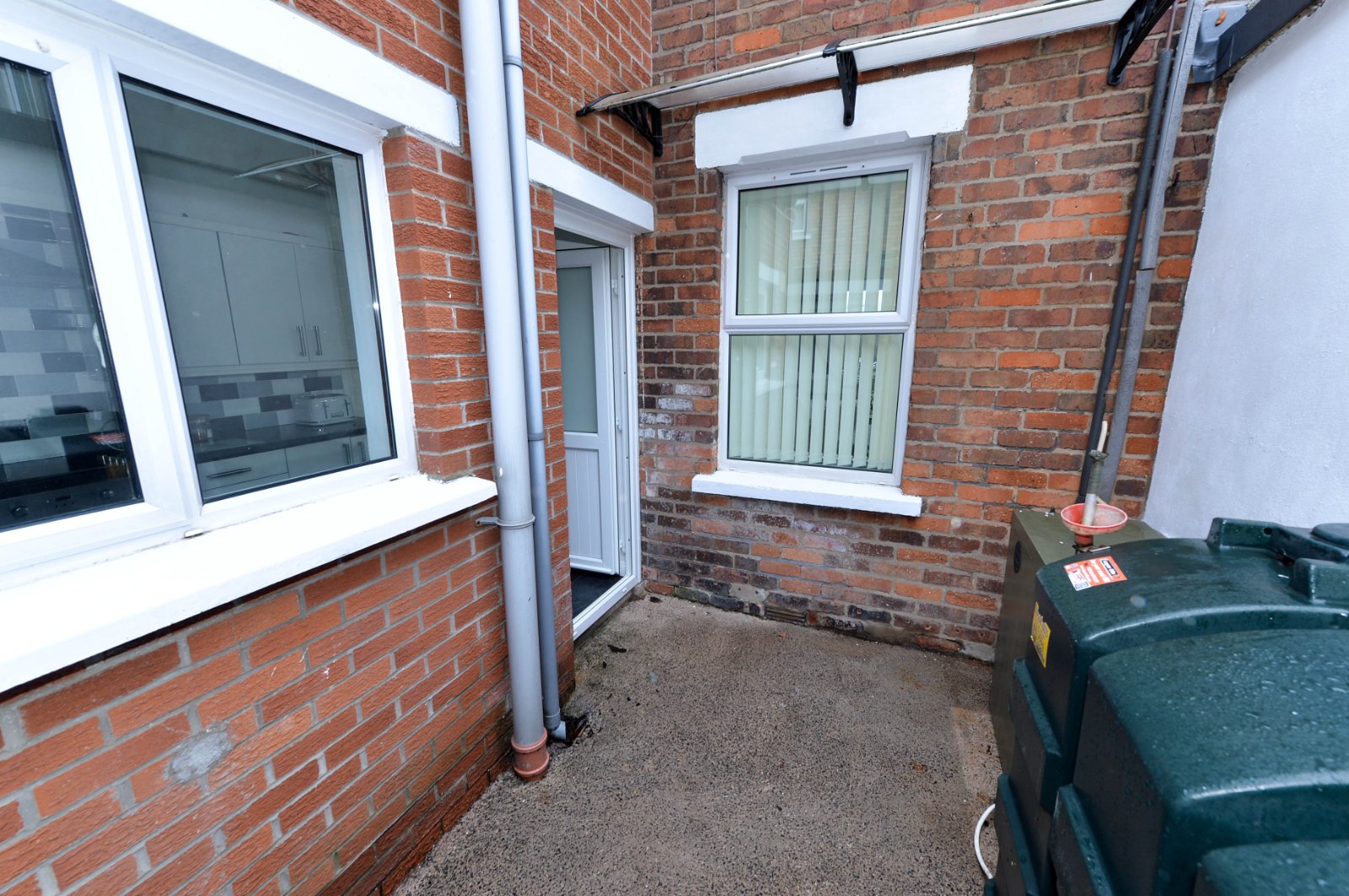 Enclosed yard to rear, PVC oil tank and boiler house with oil fired boiler.