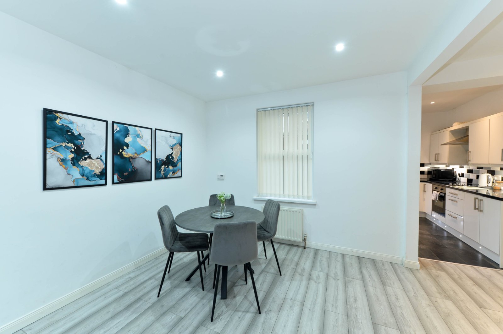 Laminate wooden floor, recessed spotlights, ample dining area.