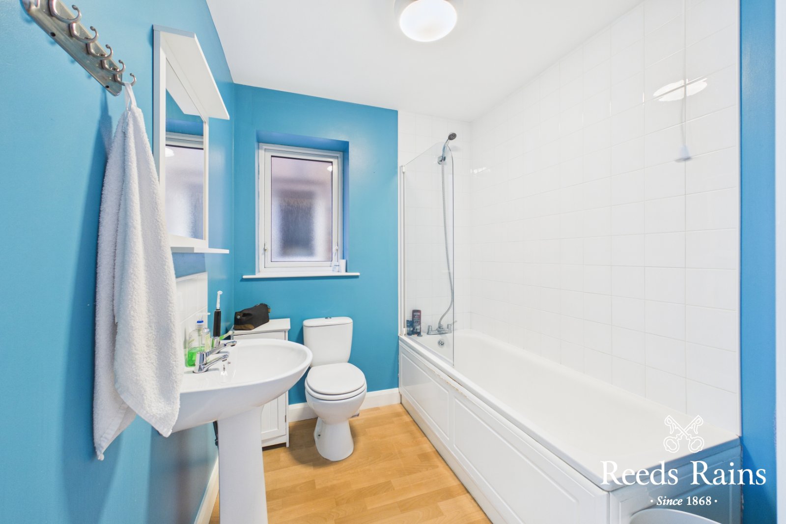 Comprising panelled bath with chrome dual mixer tap and tiled splash back. Shower screen. Pedestal wash hand basin with chrome mixer tap. Dual flush w/c. Partly tiled walls. Recessed spotlighting.