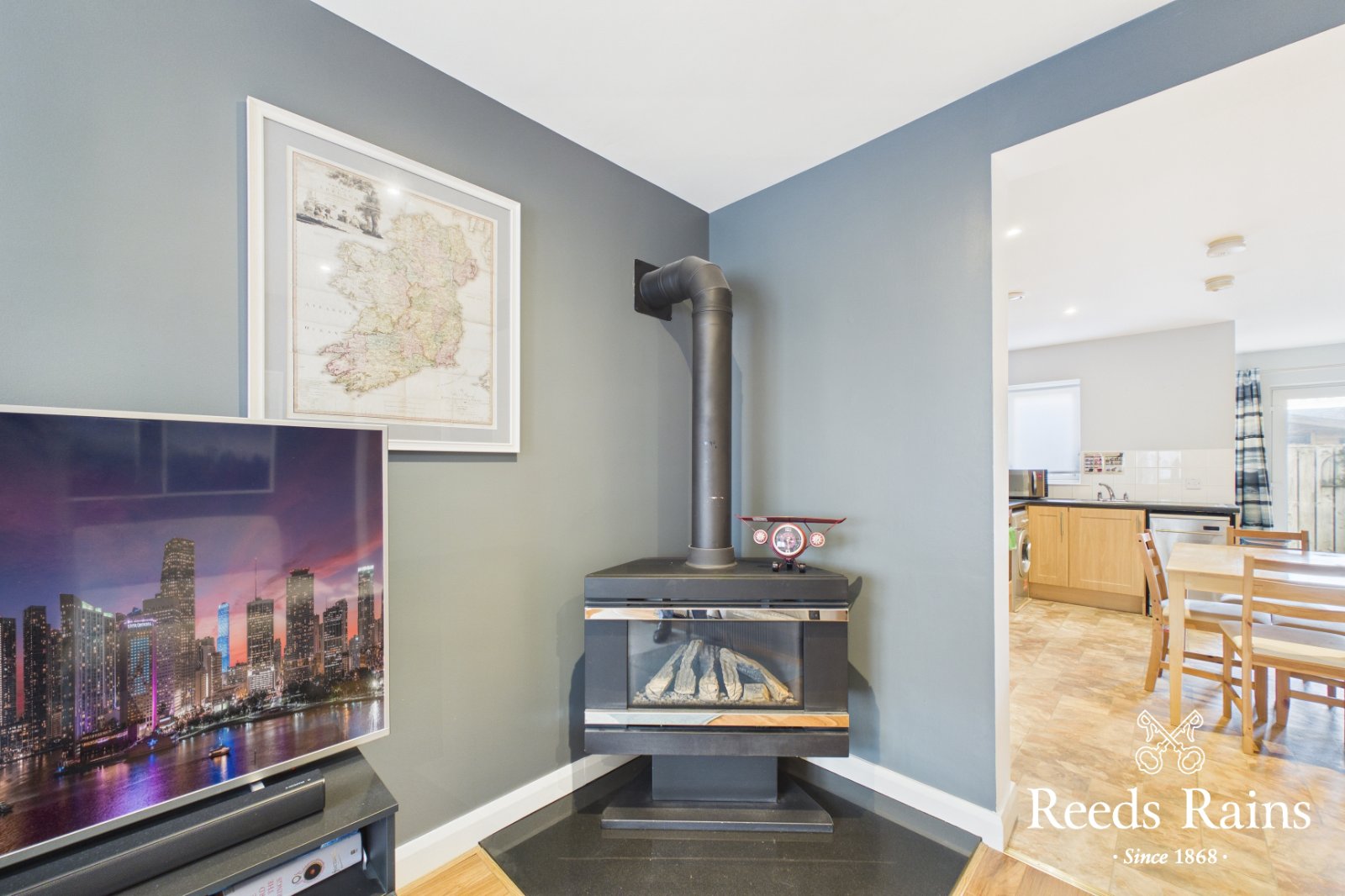 Feature gas fireplace with granite hearth. Under stairs storage. Laminated wooden flooring.