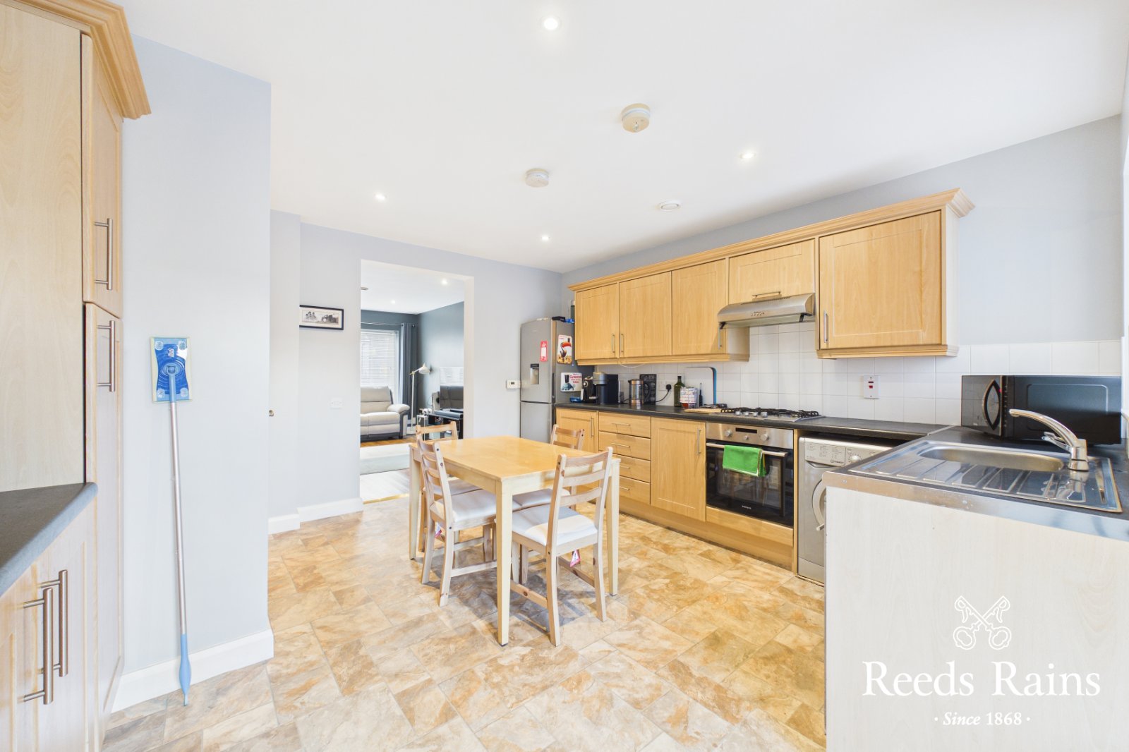 At widest points. One bowl sink unit with chrome dual mixer tap. Excellent range of high and low level units with stainless steel door furniture and formica work surfaces. Integrated four ring gas hob and built in oven with integrated extractor hood. Plumbed for washing machine. Space for fridge / freezer. Plumbed for dishwasher. Partly tiled walls. Ample dining area. Recessed spotlighting. uPVC French doors to rear.
