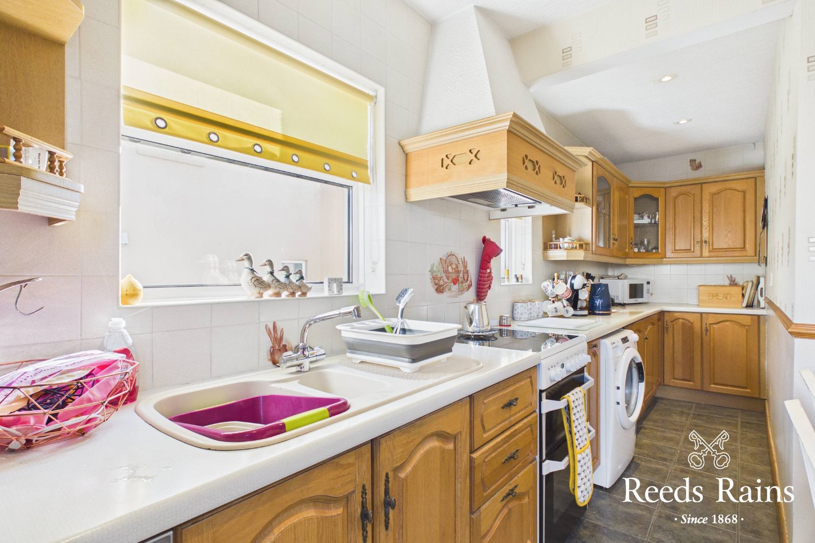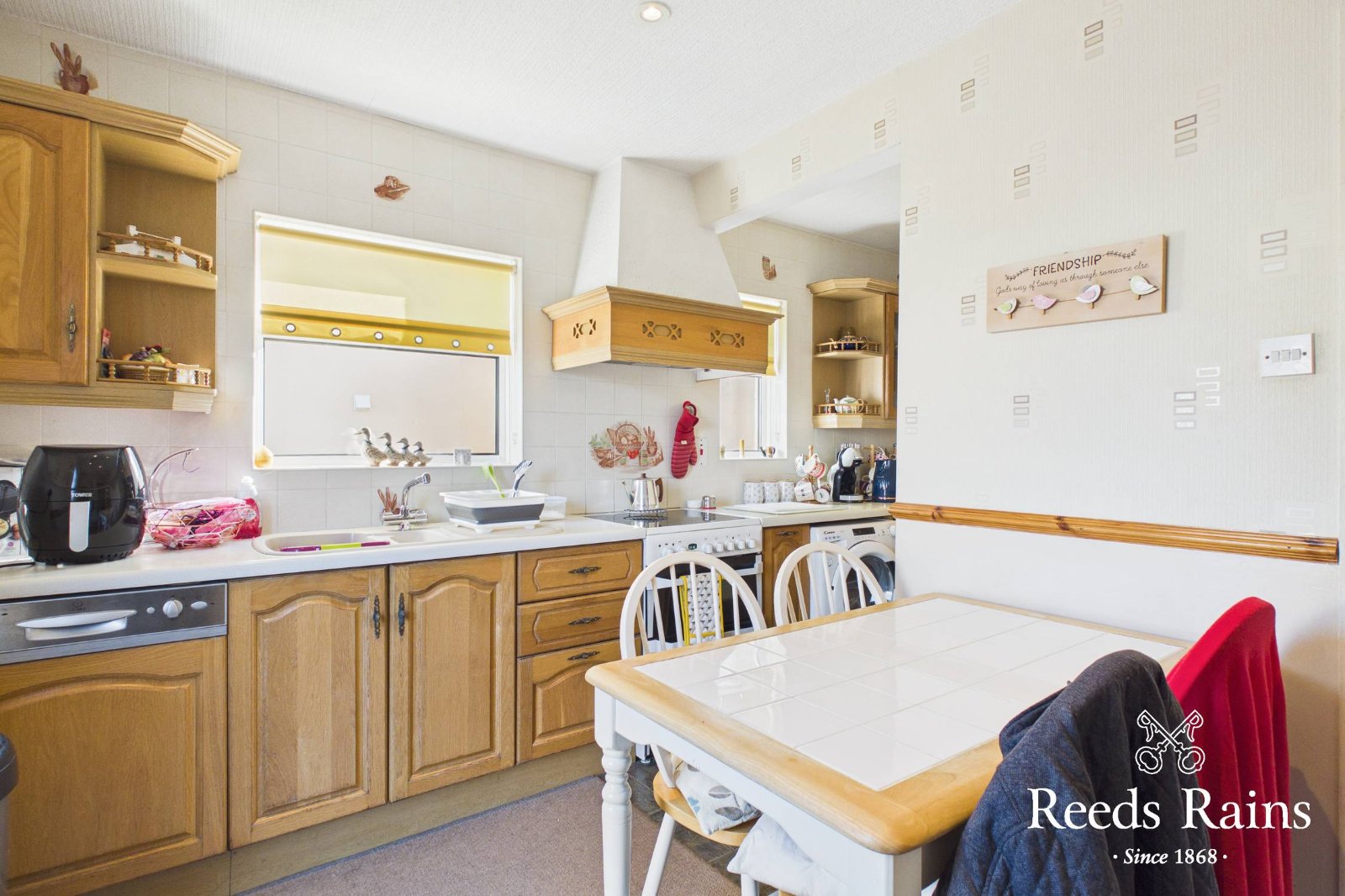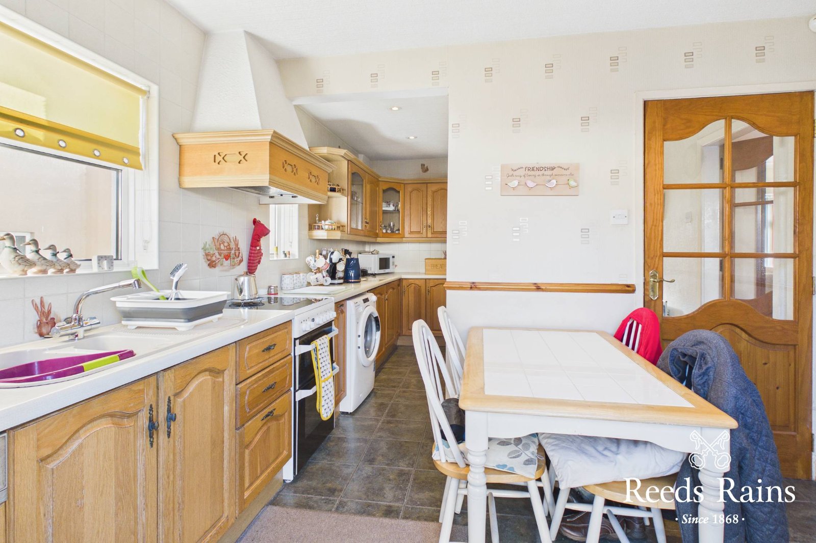 Single drainer bowl and one half sink unit with mixer taps, excellent range of high and low level units with laminate work surfaces, tiled splash back, ceramic tiled floor, cooker space, extractor fan, plumbed for washing machine, integrated dishwasher, glazed display cabinets, recessed spotlights, breakfast/dining area, uPVC double glazed back door.