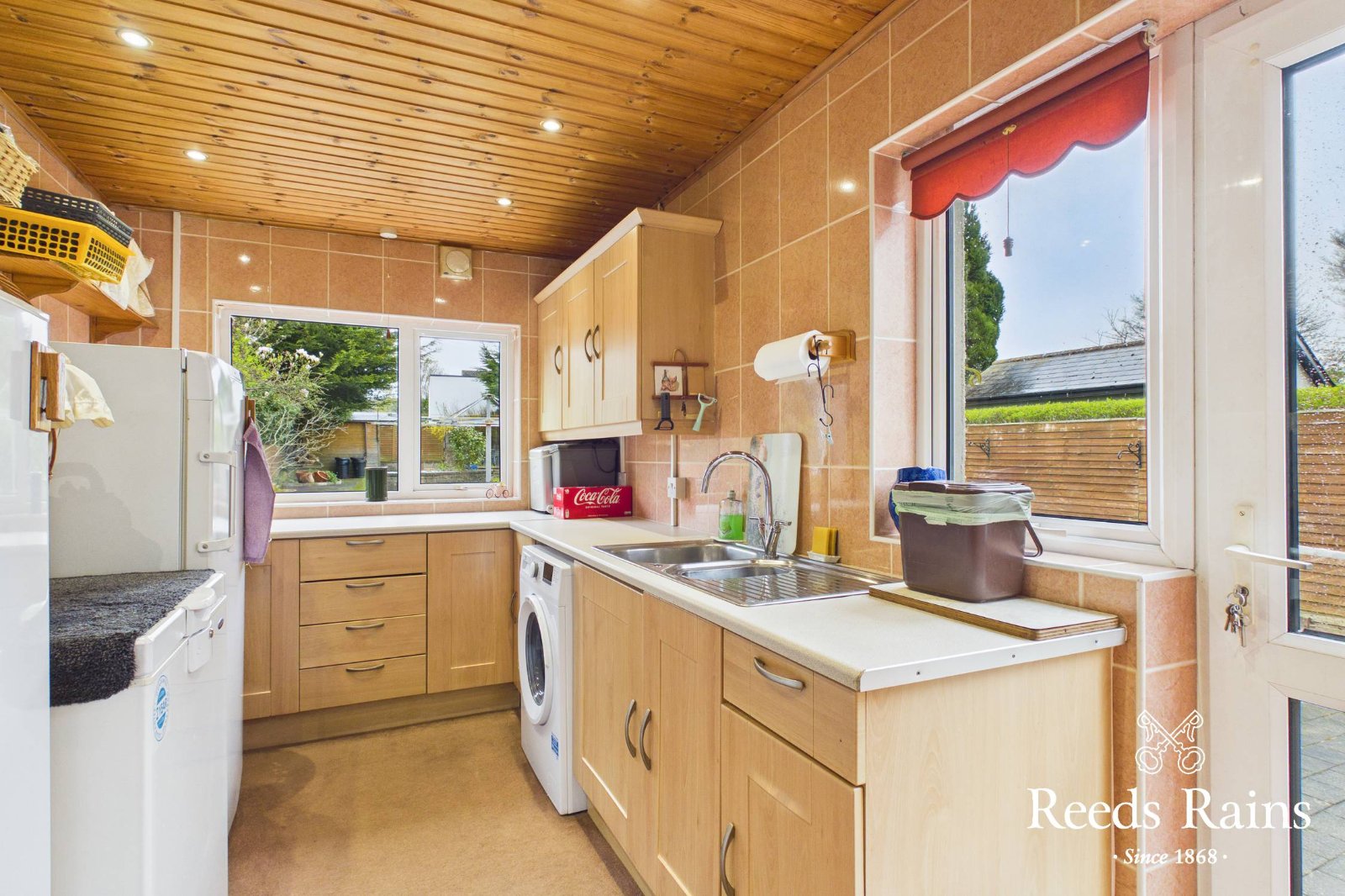 Single drainer stainless steel sink unit with mixer taps, excellent range of high and low level units with laminate work surfaces, tiled splash back, plumbed for washing machine, fully tiled walls, tongue and groove ceiling with recessed spotlights, uPVC double glazed back door.