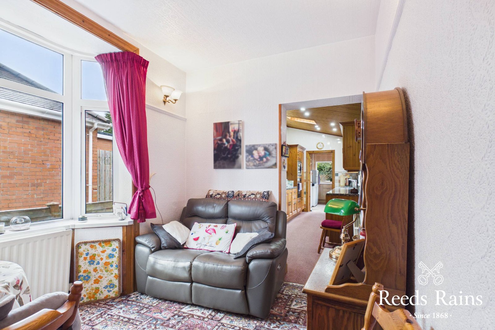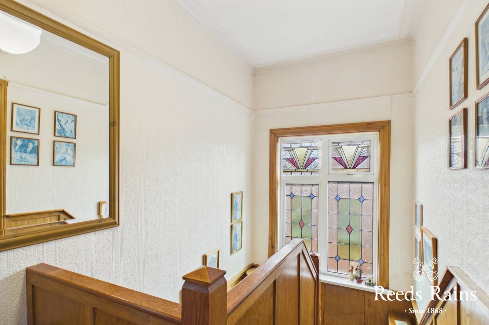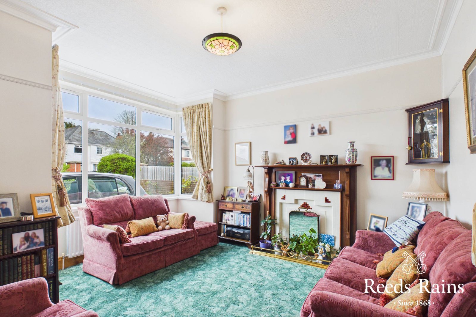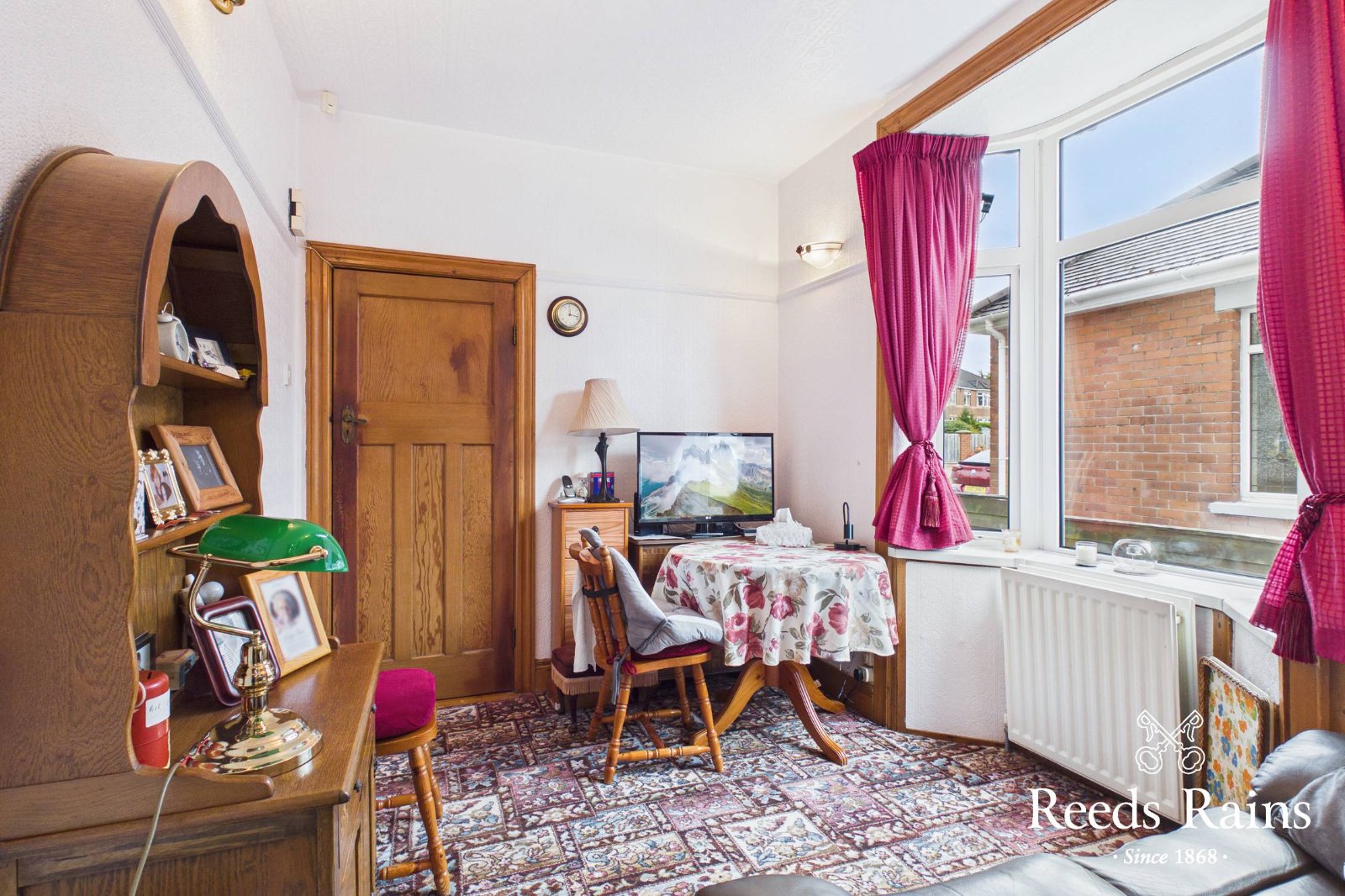 Original wooden fireplace with tiled inset and hearth, square bay, picture rail, cornice work.
