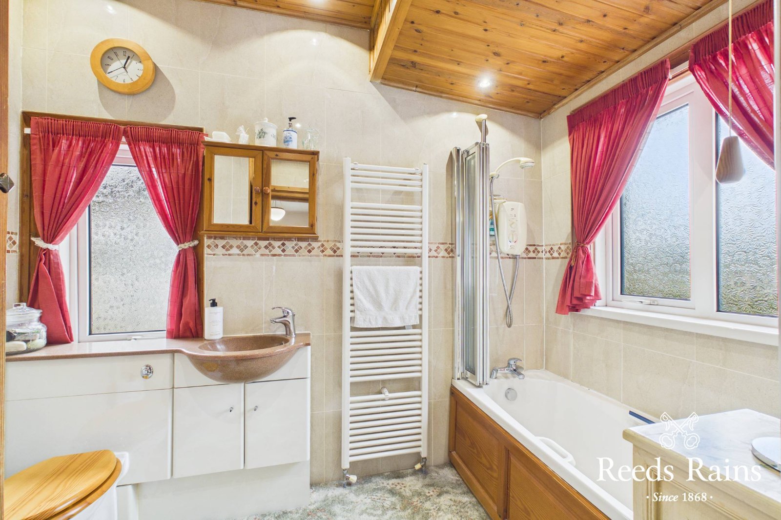 Coloured suite, panelled bath with mixer taps, Mira electric shower unit, heated towel rail, tongue and groove ceiling, recessed spotlights, vanity unit with mixer taps, dual flush close coupled WC, fully tiled walls.