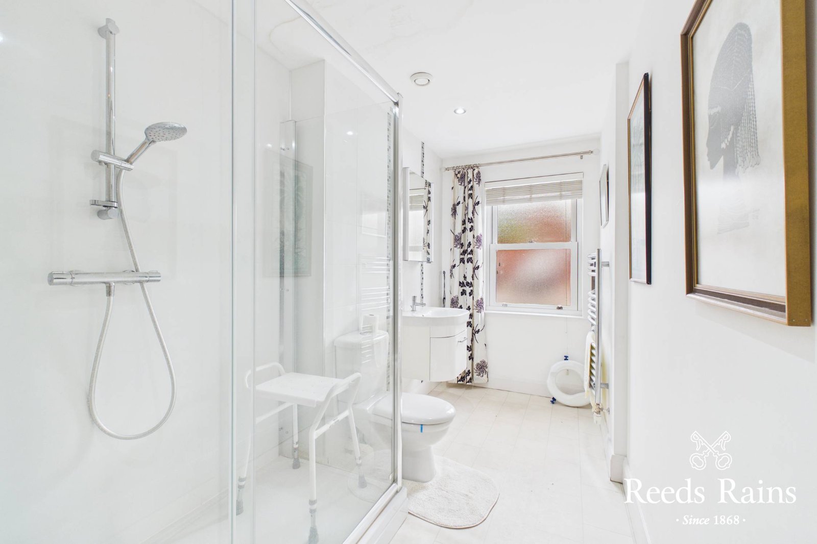 White suite, double built in shower cubicle with thermostatically controlled shower, dual flush close coupled WC, semi pedestal wash hand basin with mixer taps, part tiled walls, chrome heated towel rail.