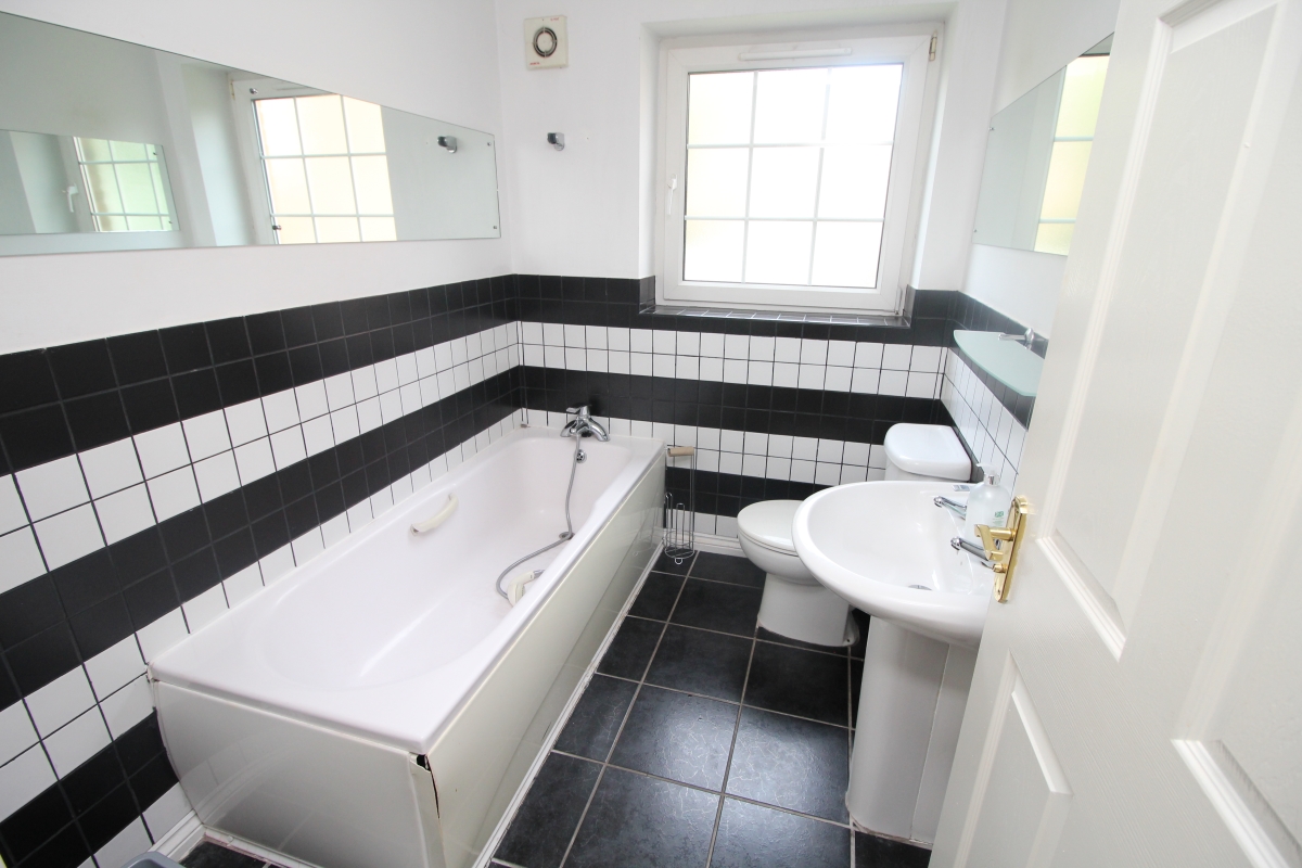 Modern bright bathroom comprising panel bath with chrome mixer taps, low flush WC, pedestal wash hand basin. Wall and floor tiling. Recessed lighting. Extractor fan. Radiator.