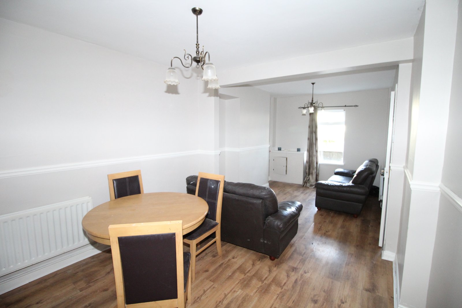 A very spacious open plan living and dining area with a laminate floor and under-stair storage cupboard.