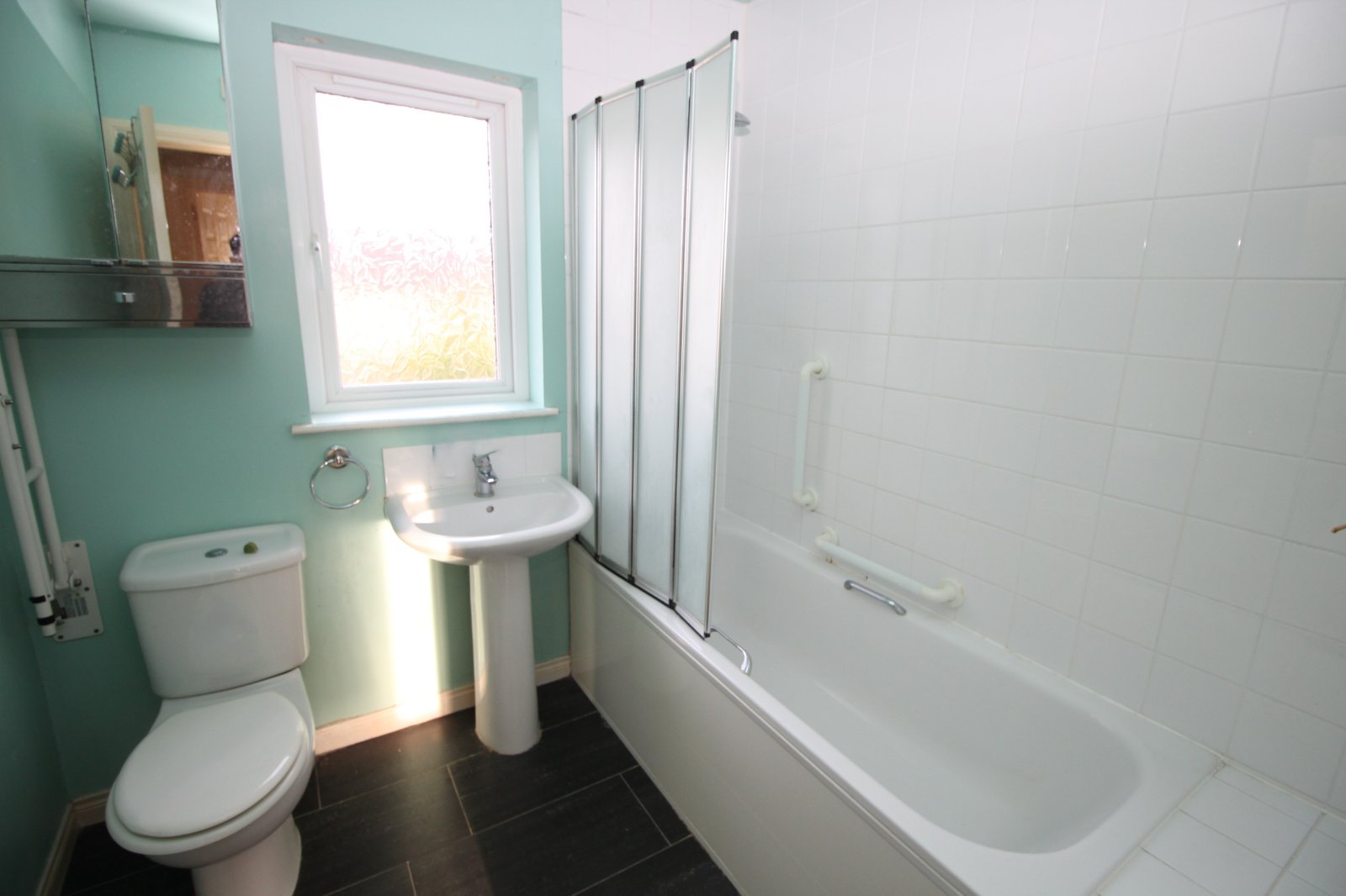 The bathroom has a three piece white suite, to include a bath with overhead shower unit, wash hand basin with mixer tap and a low flush wc. There is a tiled floor and partially tiled walls.
