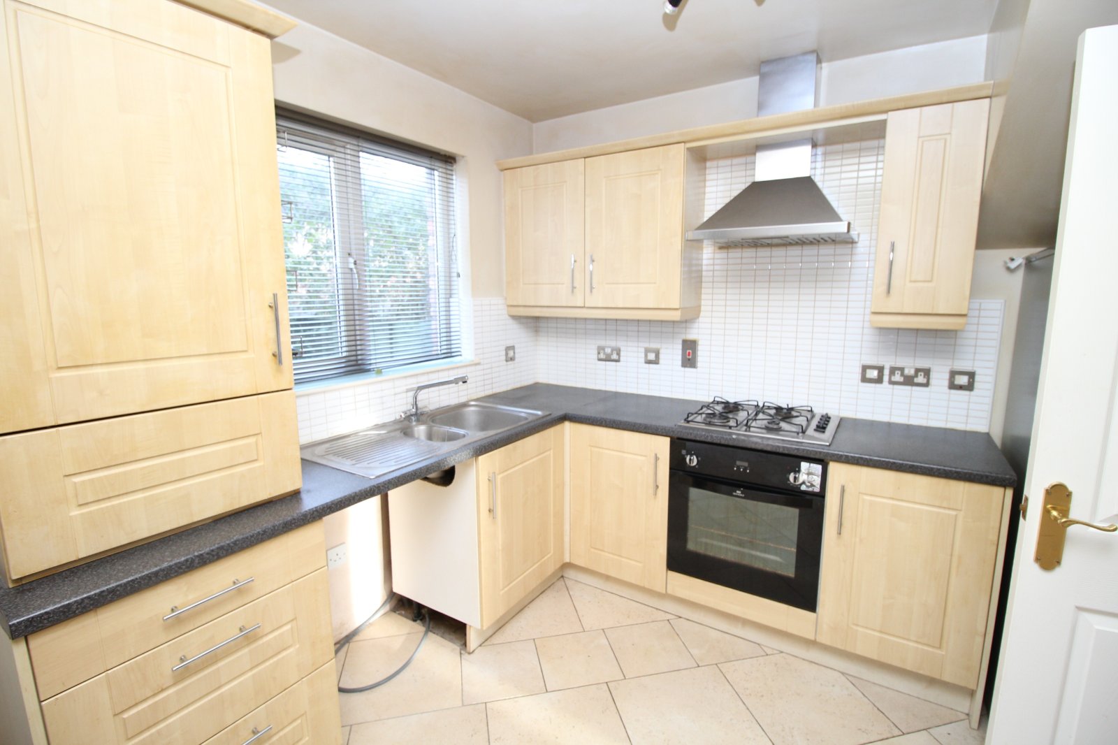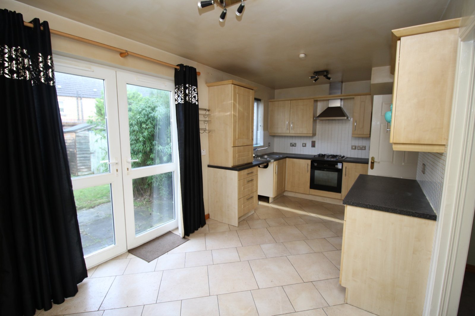 A spacious kitchen with a good range of units, integrated hob and oven, extractor and a 1.5 drainer with mixer tap. There is also ample dining space and patio doors leading out to the rear garden.
