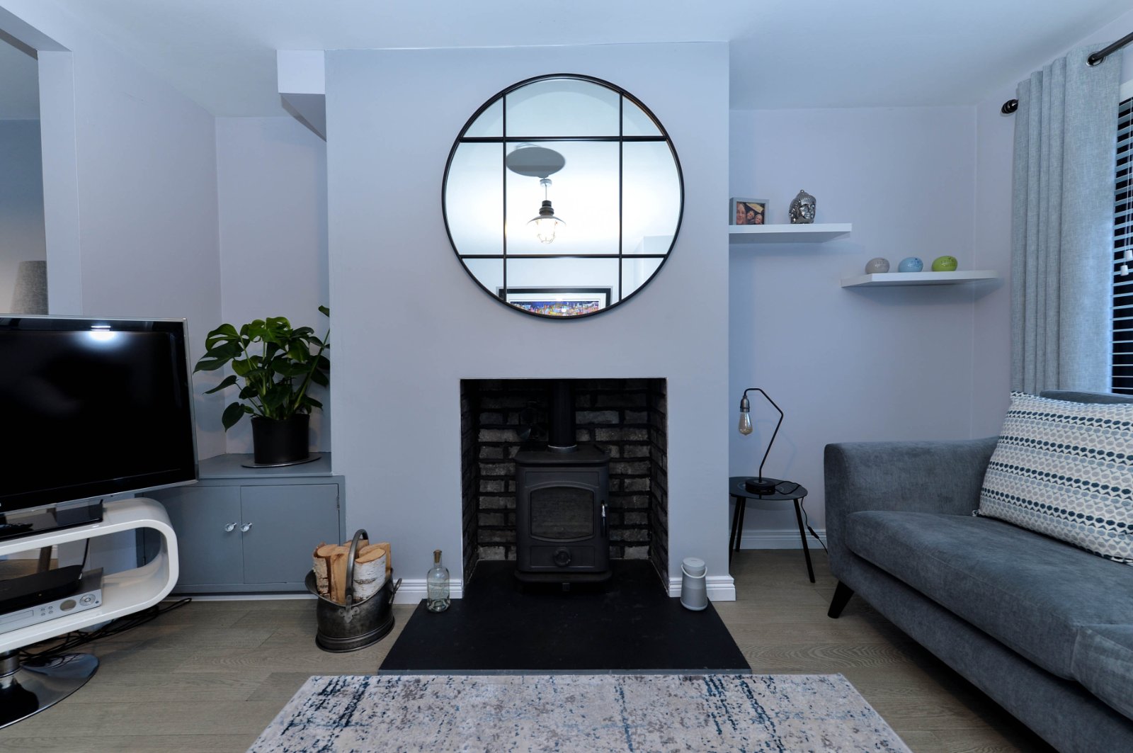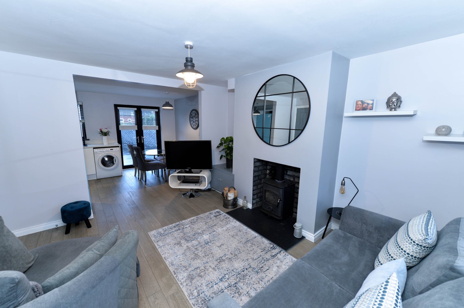 Multi fuel stove, slate hearth, laminate wooden floor, under stairs storage
