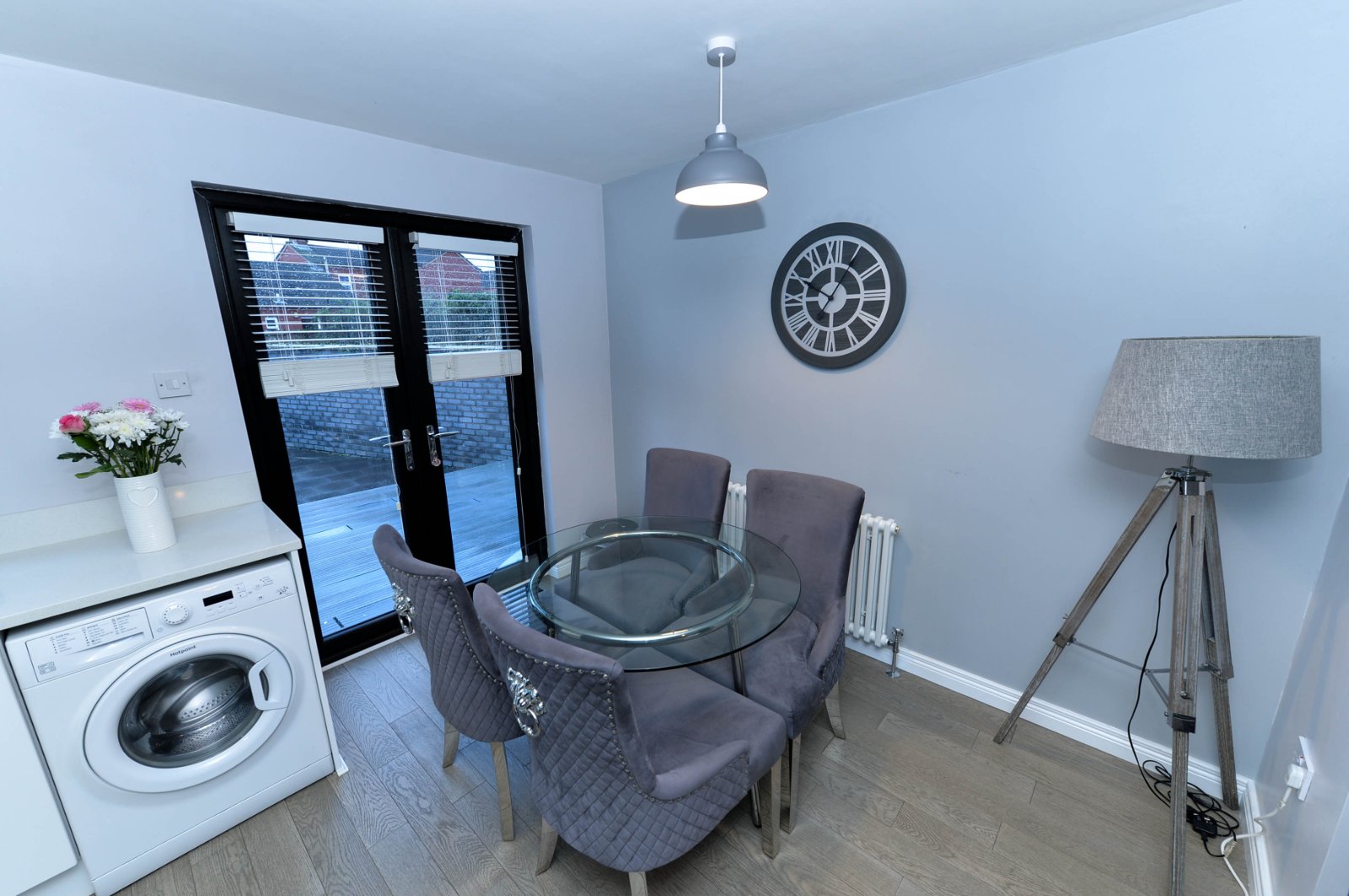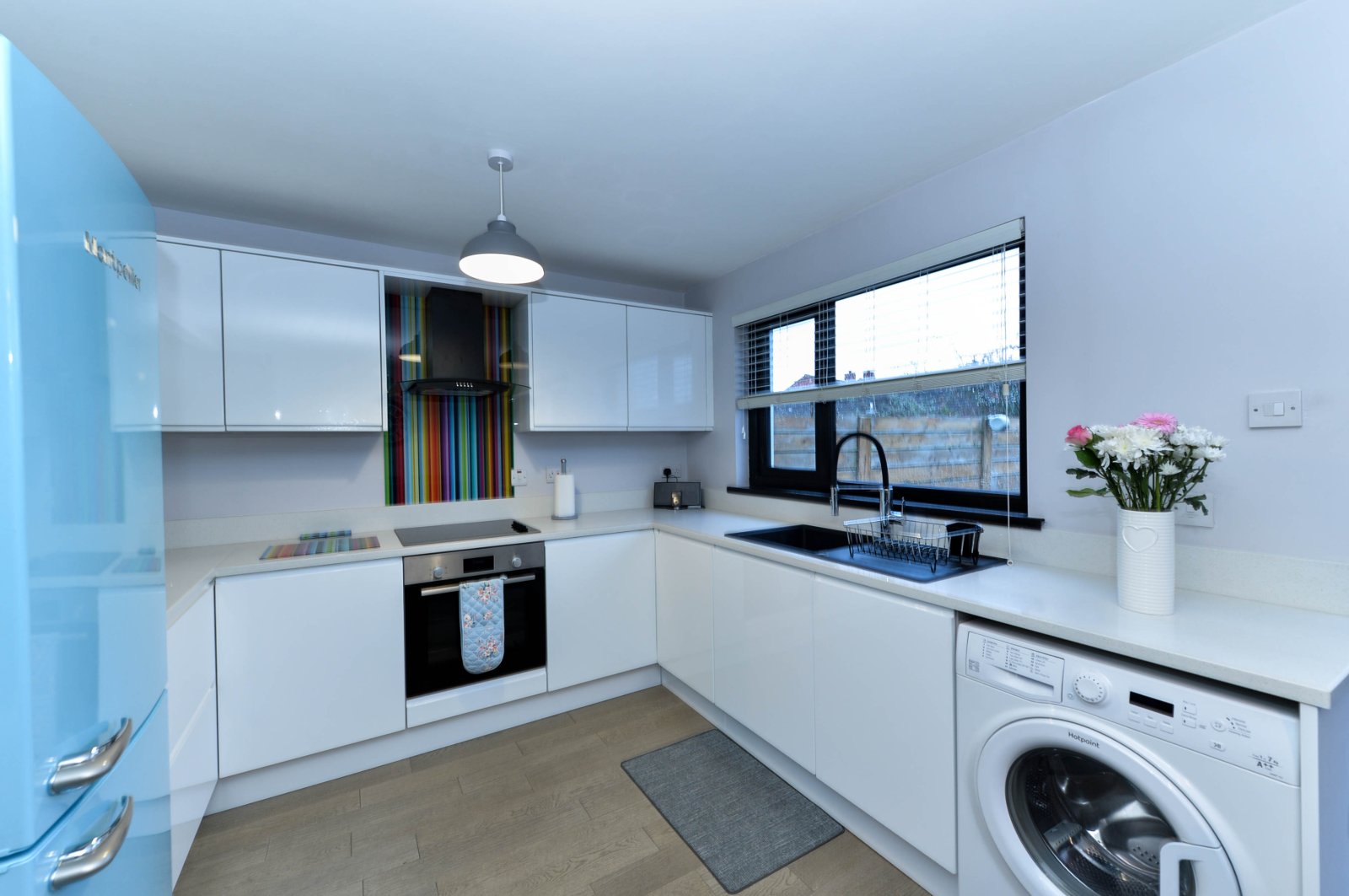 Franke sink unit with drainer and mixer taps, excellent range of high and low level units, Quartz work surfaces and upstand, laminate wooden floor, plumbed for washing machine, stainless steel built in oven and four ring ceramic hob, chimney extractor fan, feature glass multi colour splash back, ample dining area, double glazed French doors to rear garden.