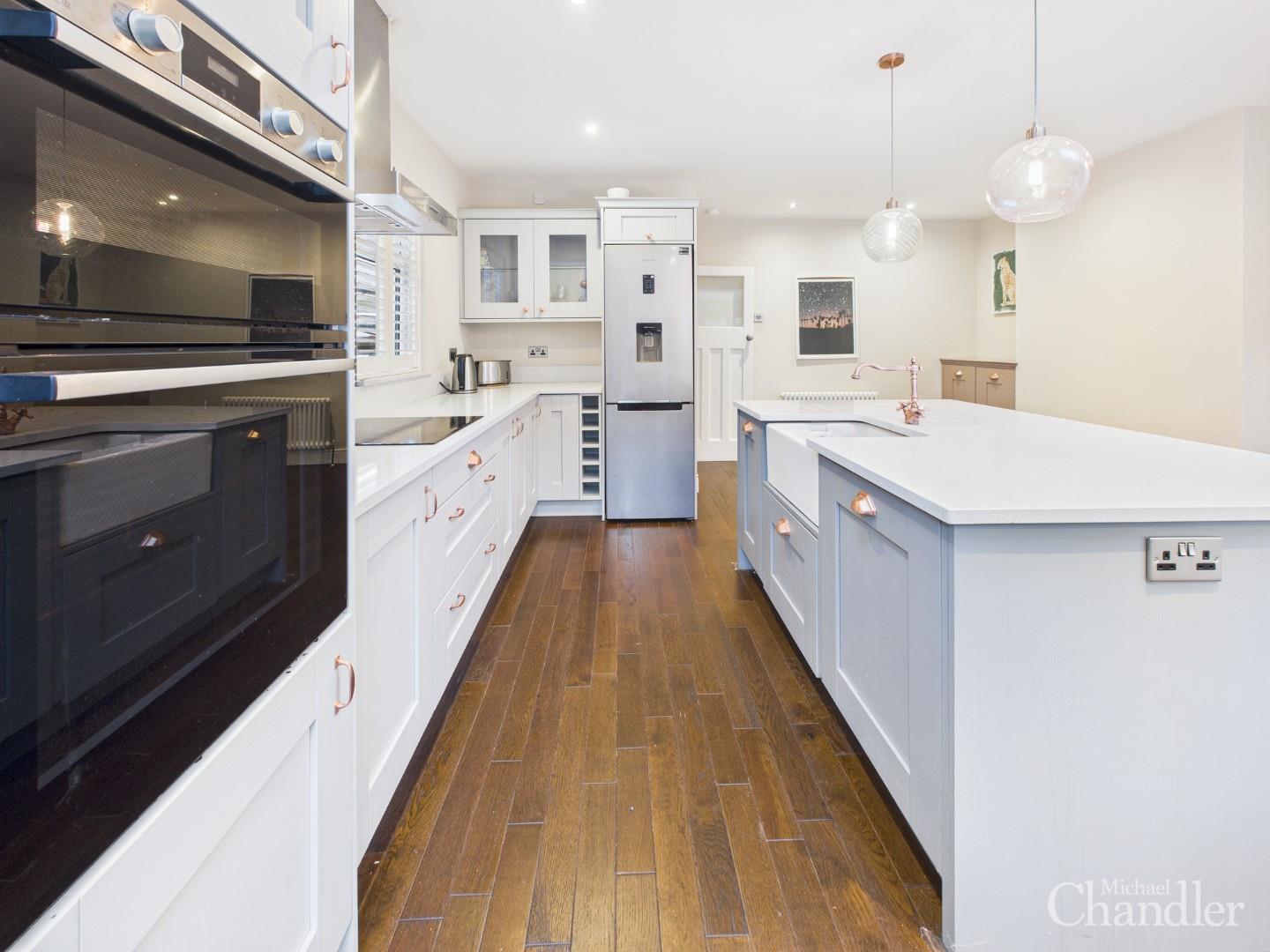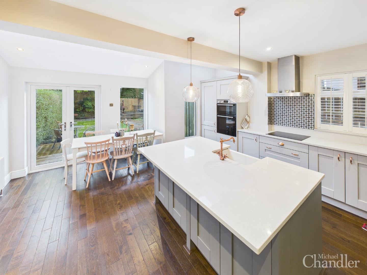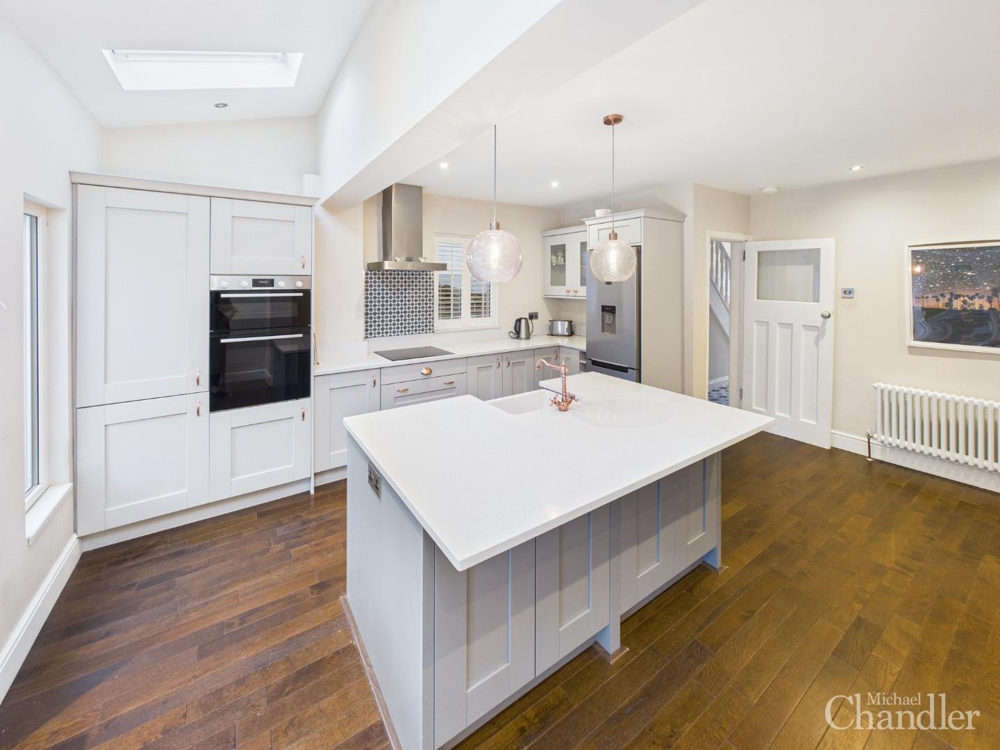 As you enter, you are greeted by a welcoming lounge featuring a wood-burning stove, perfect for cosy evenings in. The heart of the home is the modern fitted kitchen, which includes a striking feature island, built in appliances and an open-plan dining area, creating a wonderful space for entertaining guests or enjoying family meals.