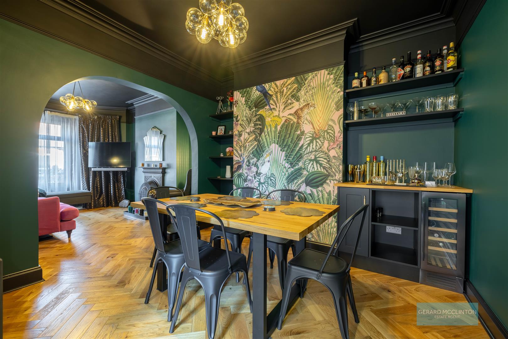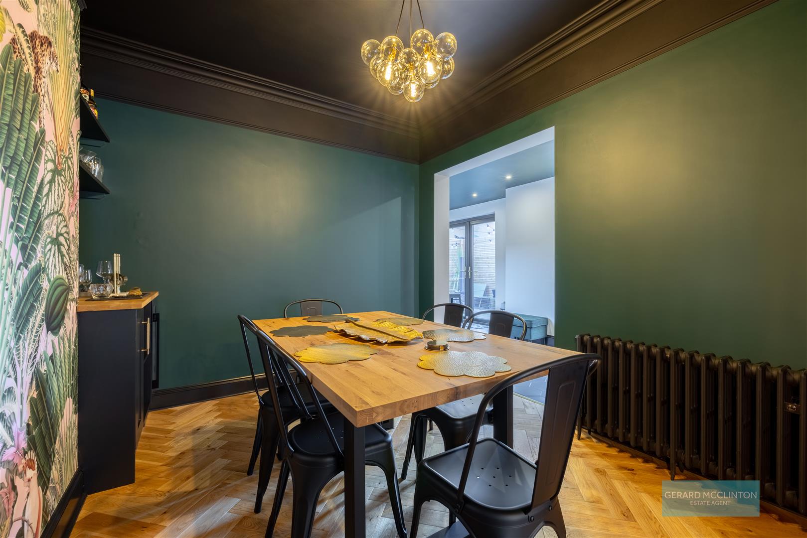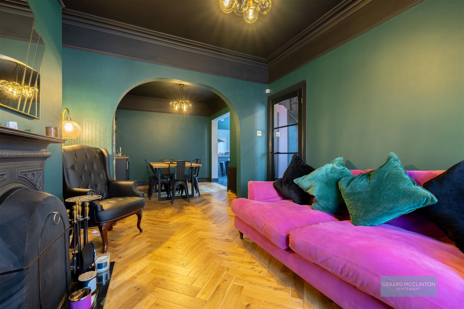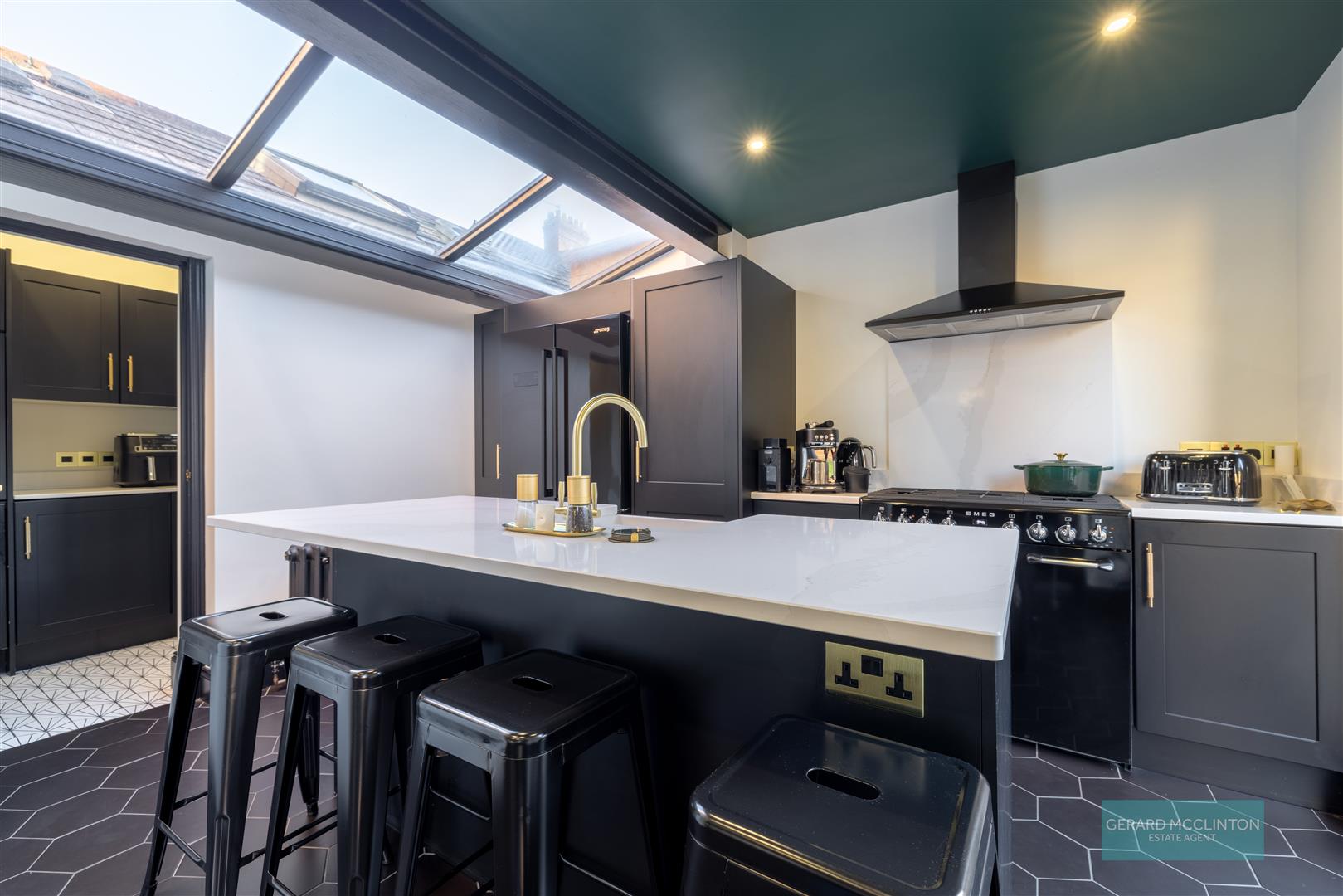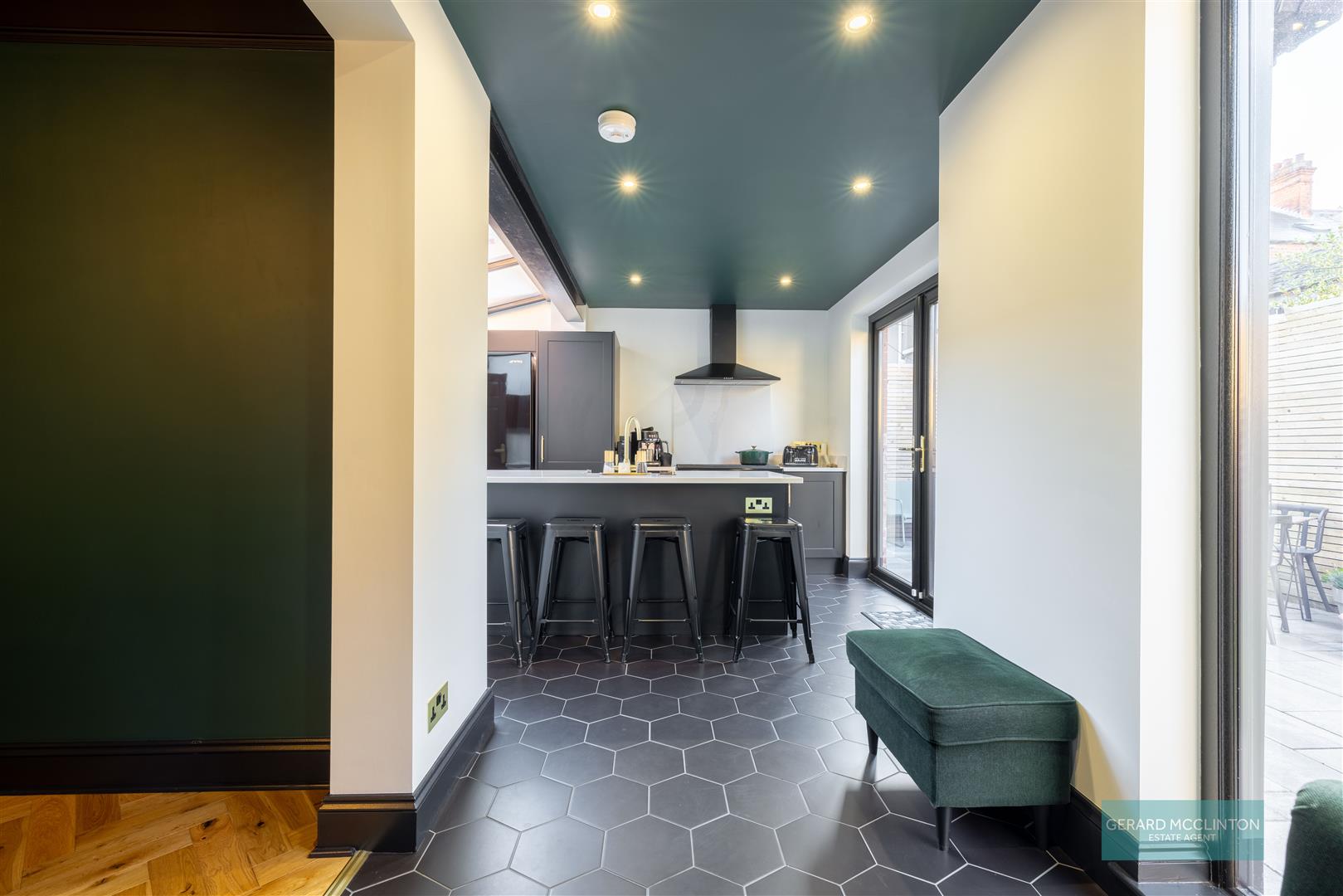 The entrance hall, what a way to be greeted into this home, with the original black and white tiled floor, restored by the current owner along with the original coving. The hall leads you through to the open plan living dining room. With a bold and striking colour scheme this contemporary room also combines a newly installed cast iron fireplace with working open fire, again keeping the charm of the original build. Ample space in this room to relax, dine and entertain. An open arch leads through to the centre piece of this home. An extended open kitchen with large central island that invites an abundance of light in due to the double doors, large glazing to the side and feature roof glazing.