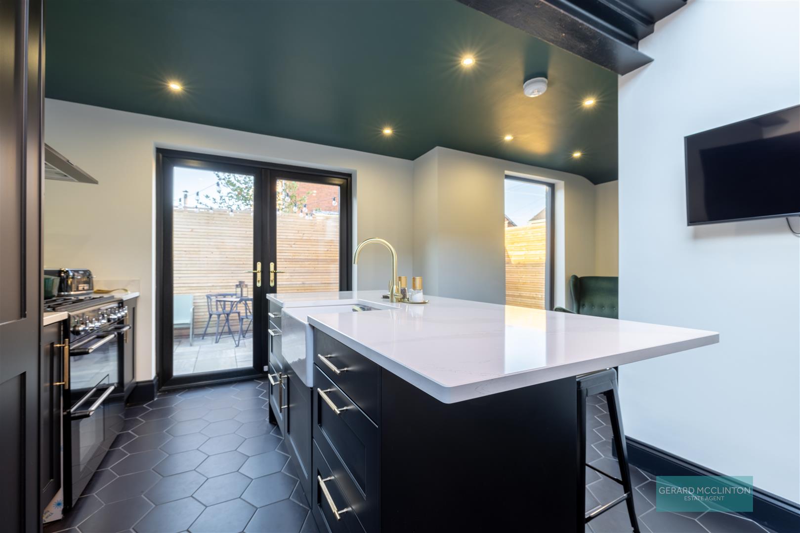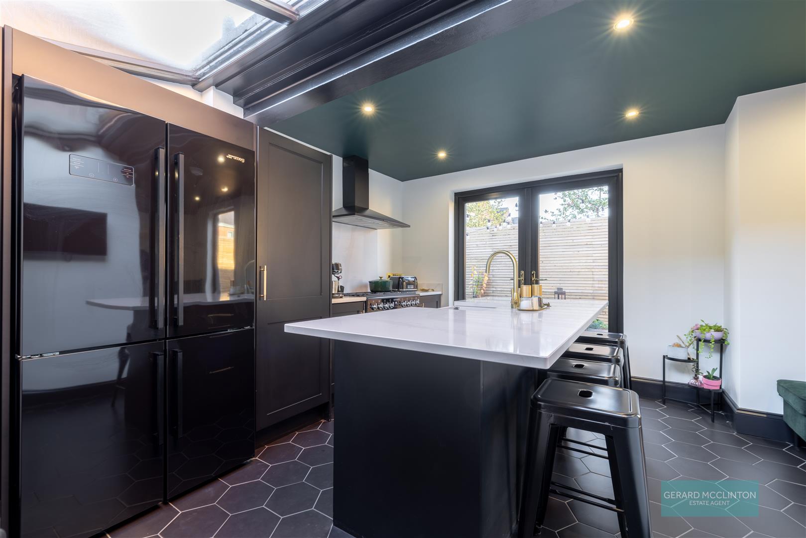 Extended Kitchen with Double Doors to Rear Garden, Sleek Black Units & Central Island
