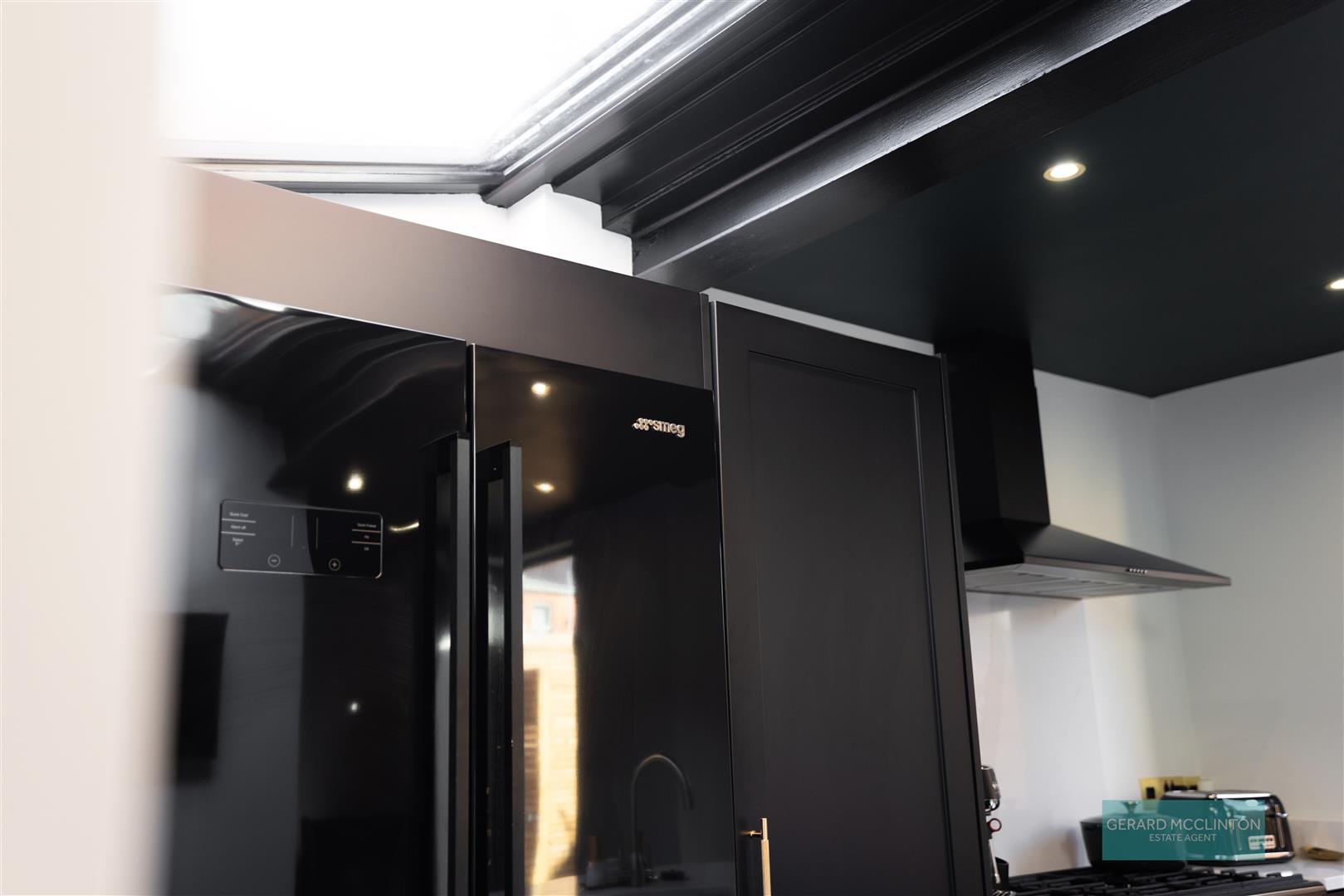 This superb room is an extension to the rear of the house, the original rear door is now a full floor to ceiling window, there are newly installed double doors leading onto the south facing garden, plus the ceiling is adorned with vast glazing. This part of the house is filled with natural light and combines the outdoors inside combo perfectly. A sleek black fitted kitchen with range of wall and base units offers ample storage ands space for a range oven and American style fridge freezer. A central island with stone worktop, breakfast bar seating area and beautiful Belfast sink sits perfectly in the centre of the room.
