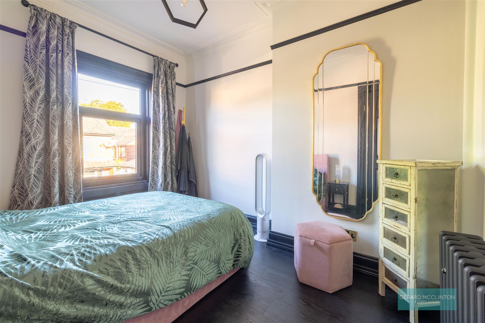 Newly installed UPVC double glazed window to rear, antique style radiator, picture rail and cornice