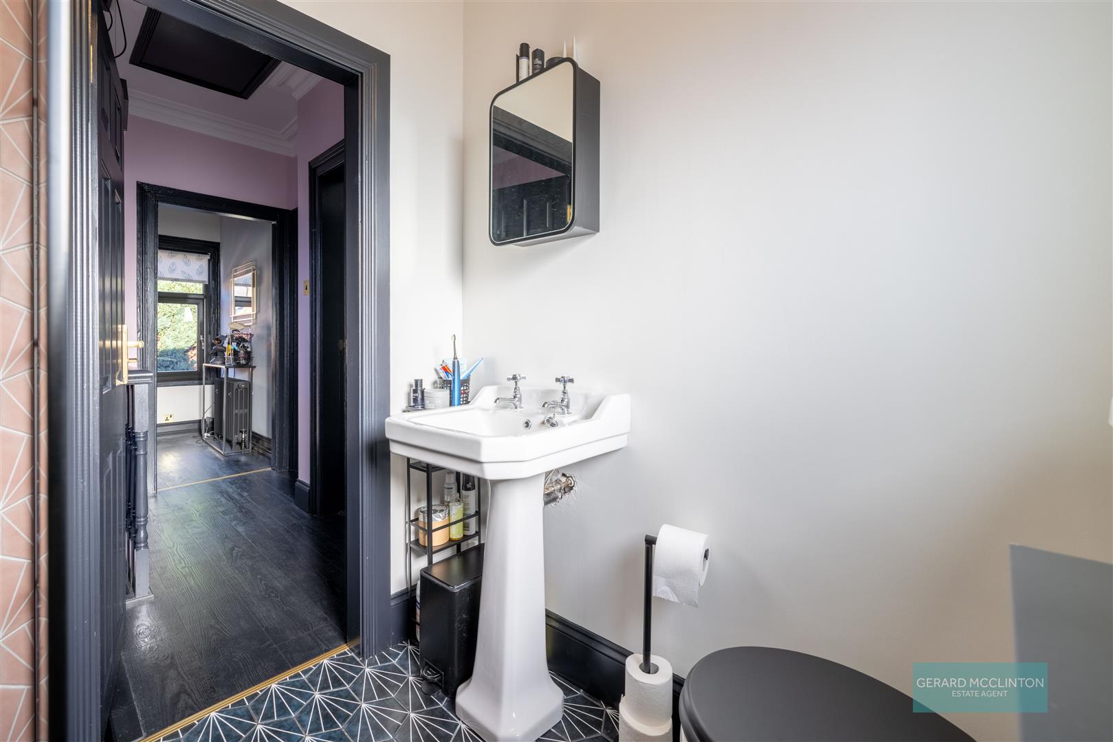 On the first floor are three bedrooms, two generous doubles and a single bedroom. The bathroom now is a contemporary shower room with feature black fittings.