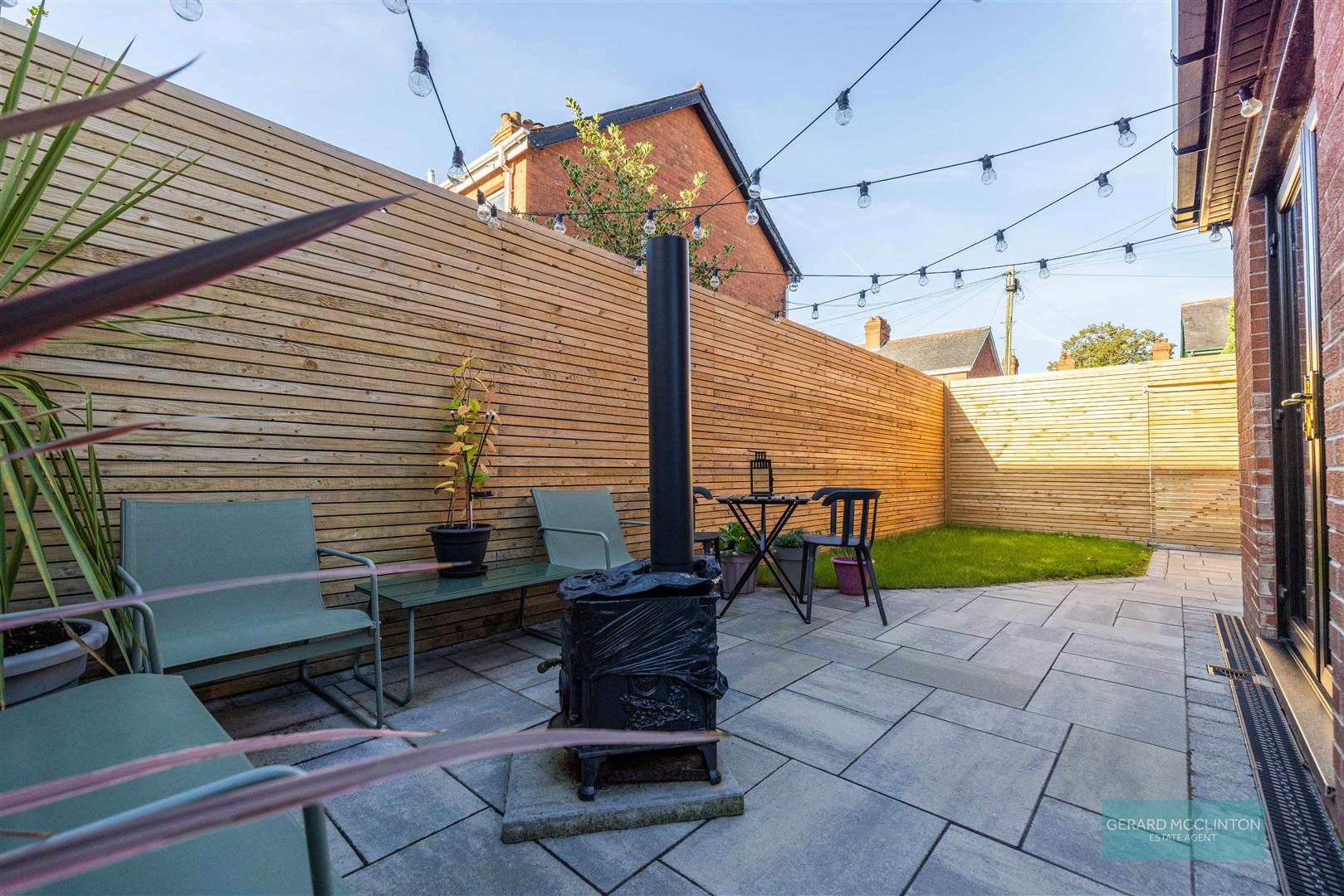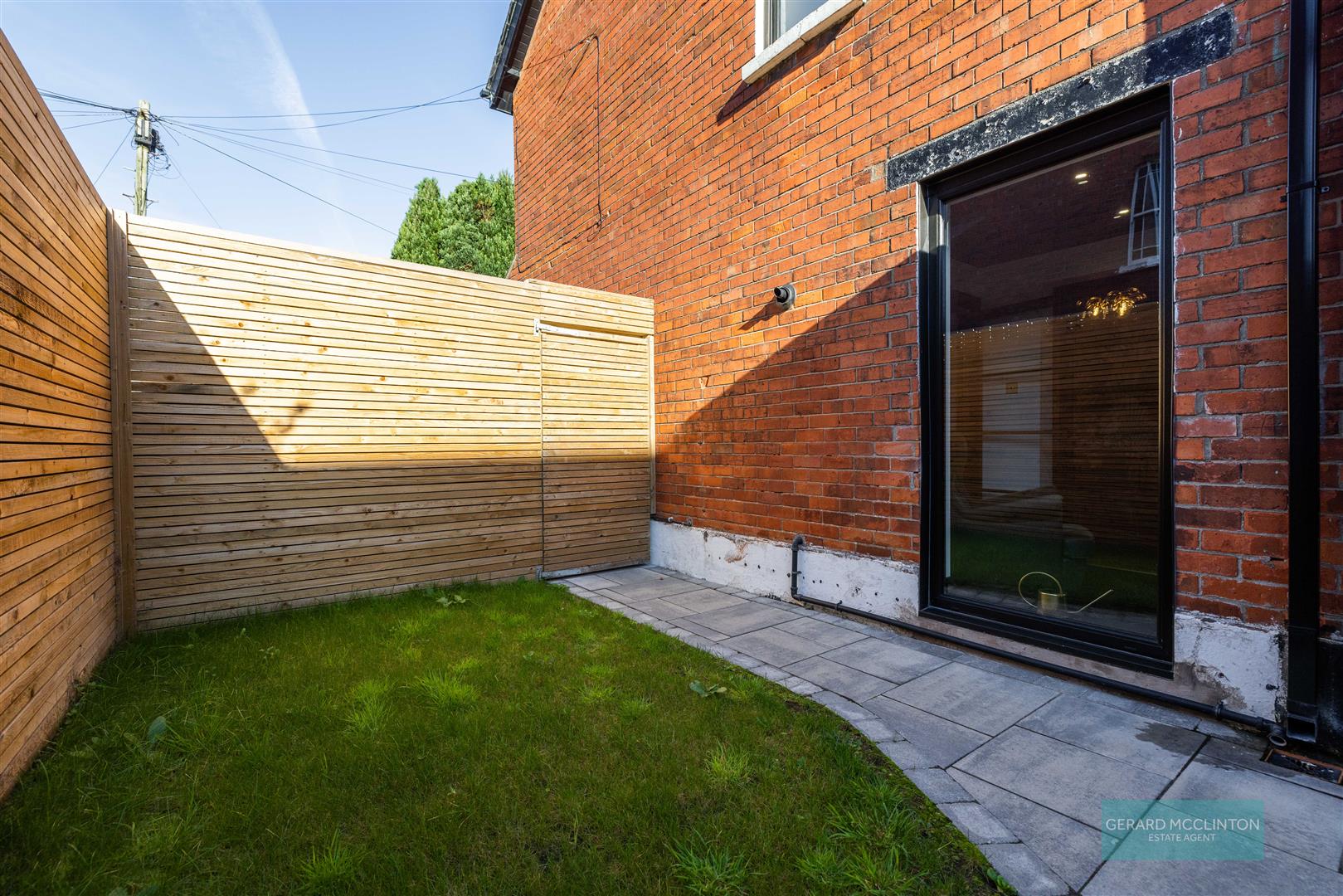 Rear garden, South facing with newly laid paving, re seeded lawn area and new fence surrounding.