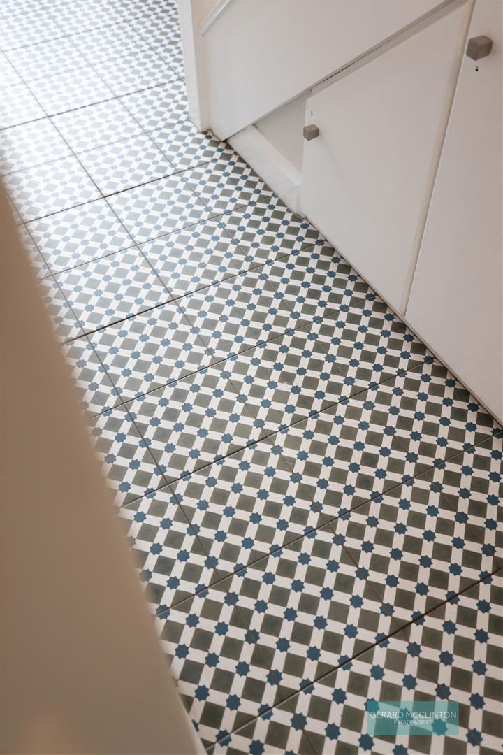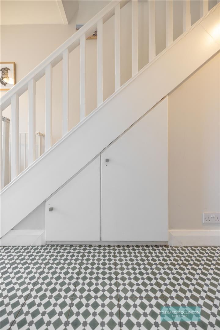 Attractive tiled flooring, radiator, Upvc entrance door, concealed storage into staircase with plumbing for washing machine, staircase to first floor