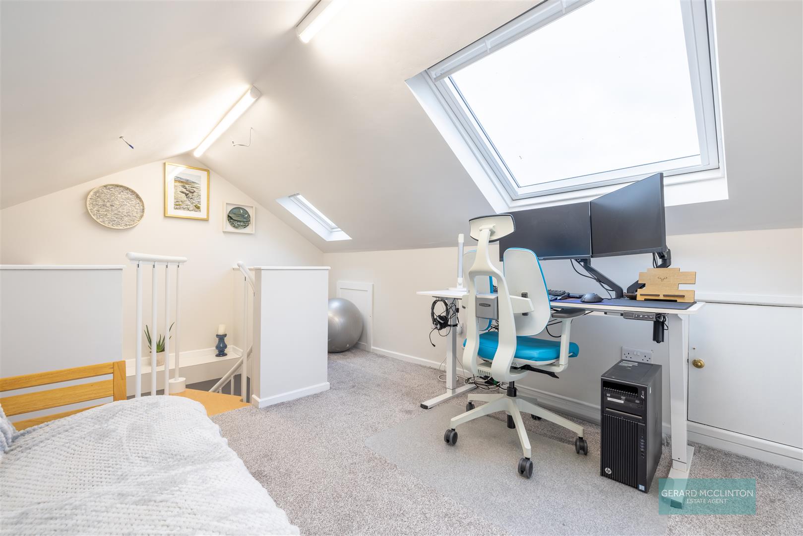 Fixed spiral staircase, floored and carpeted, light, power, built in storage, roof window installed and boarded walls.