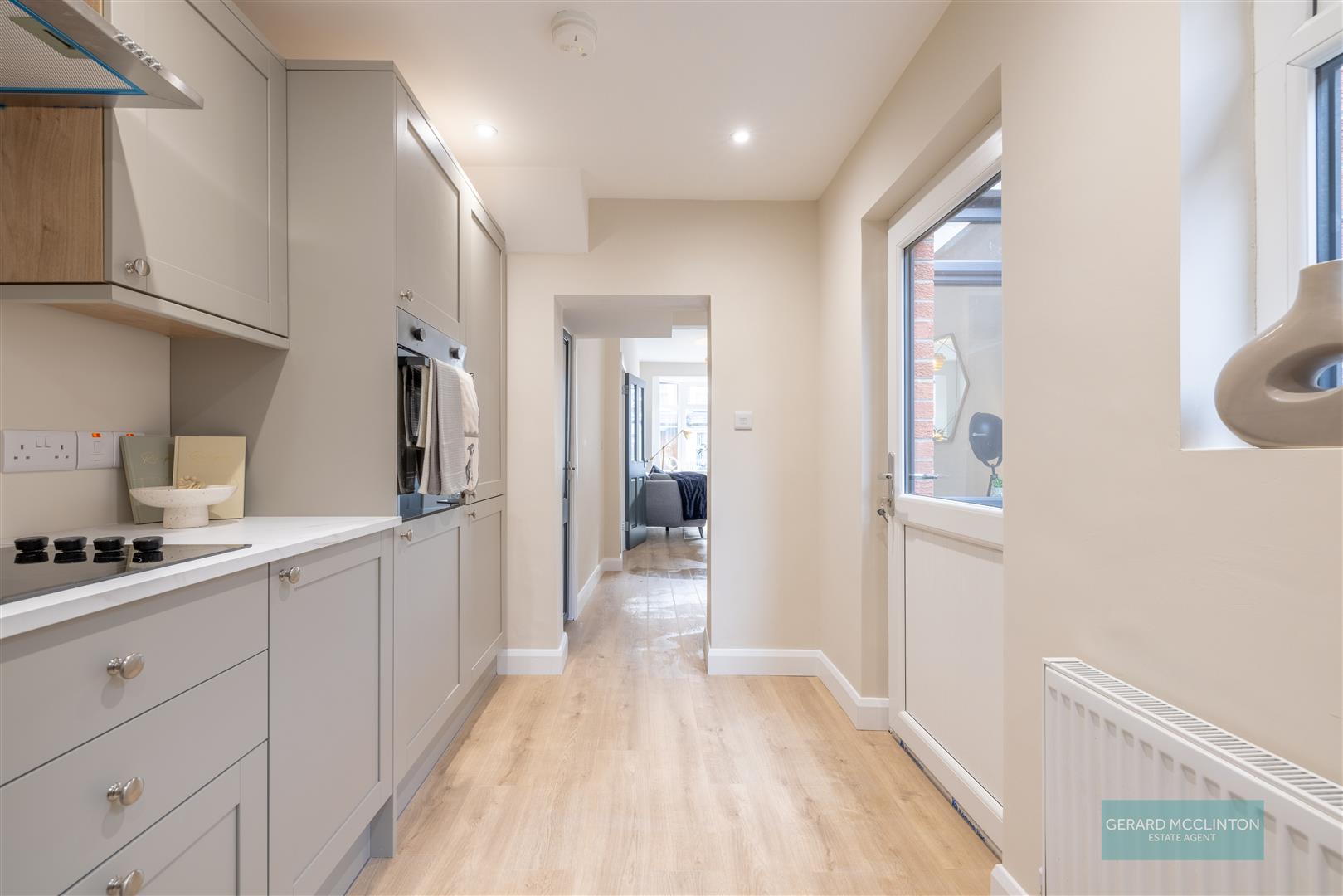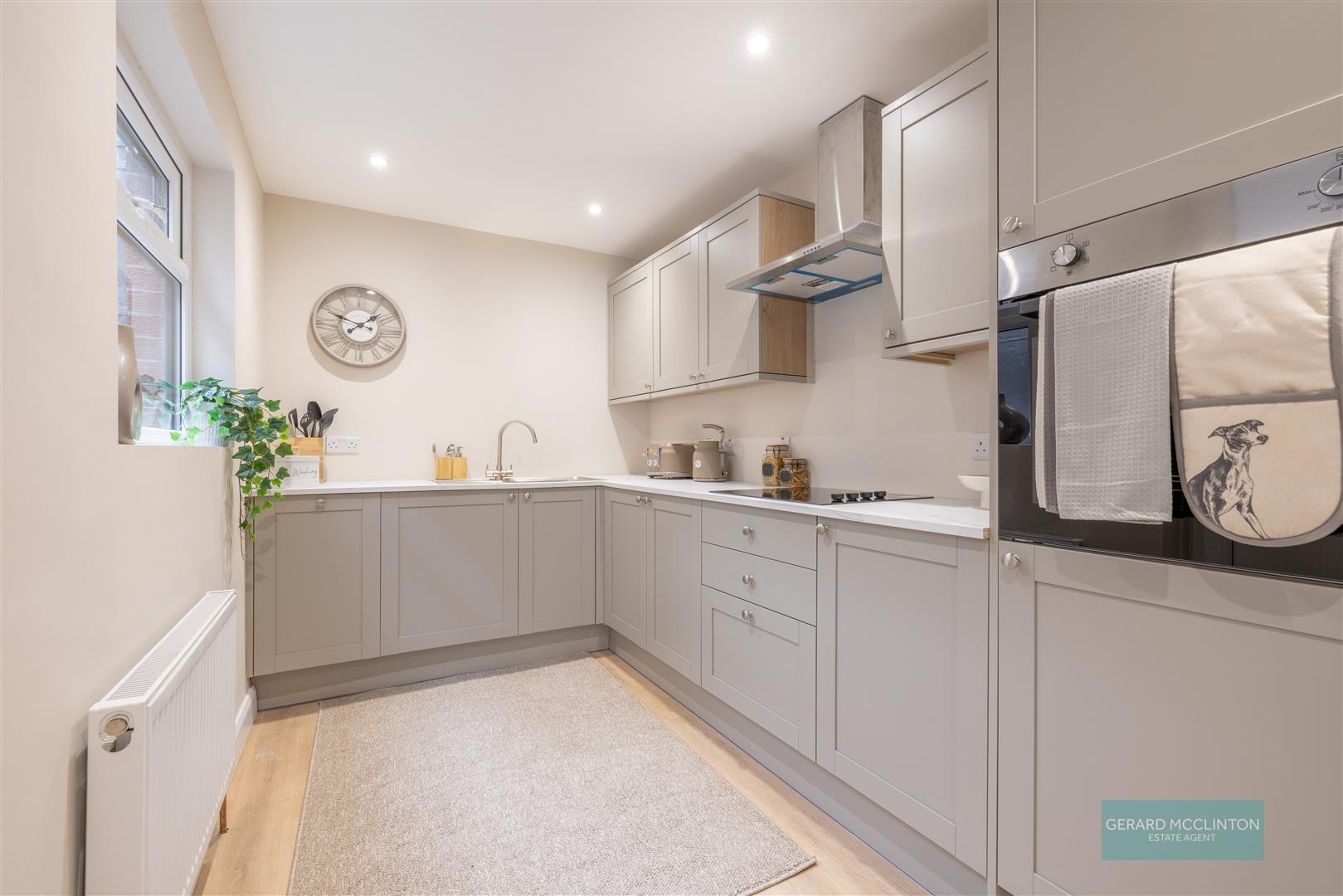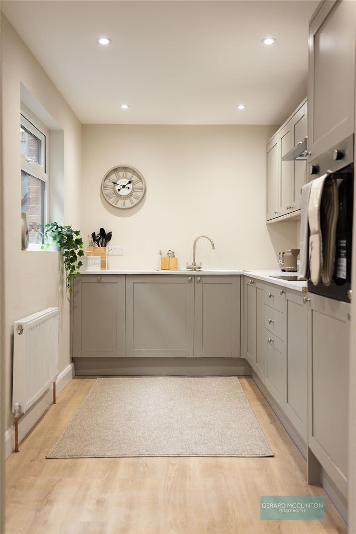 New upvc double glazed window and door to rear yard, new laminate wooden flooring, newly installed kitchen with "pebble" colour soft close units, quartz effect worktops and a range of integrated appliances including fridge freezer, electric oven, 4 ring electric hob, extractor hood over, washing machine and slimline dishwasher. single drainer sink unit with mixer tap, new spotlights, new hardwired smoke detector