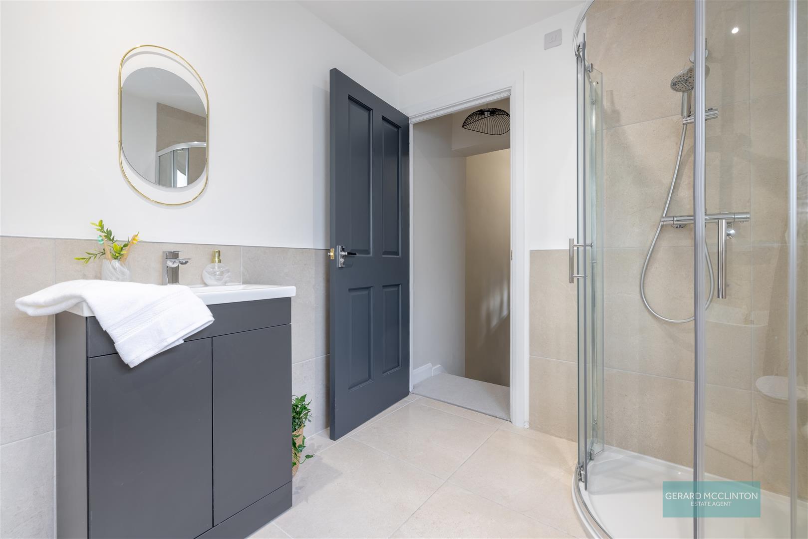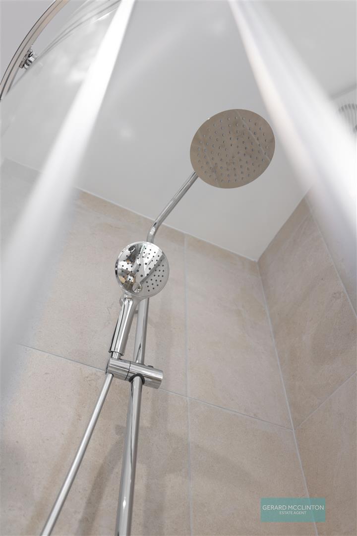 Upvc double glazed window to side, new tiled floor, part tiled walls, new suite comprising freestanding bath with feature floor mounted taps, a separate shower cubicle with thermostatic rainfall style shower, wash hand basin with vanity unit under, close coupled wc. new spotlights, extractor fan and heated towel rail