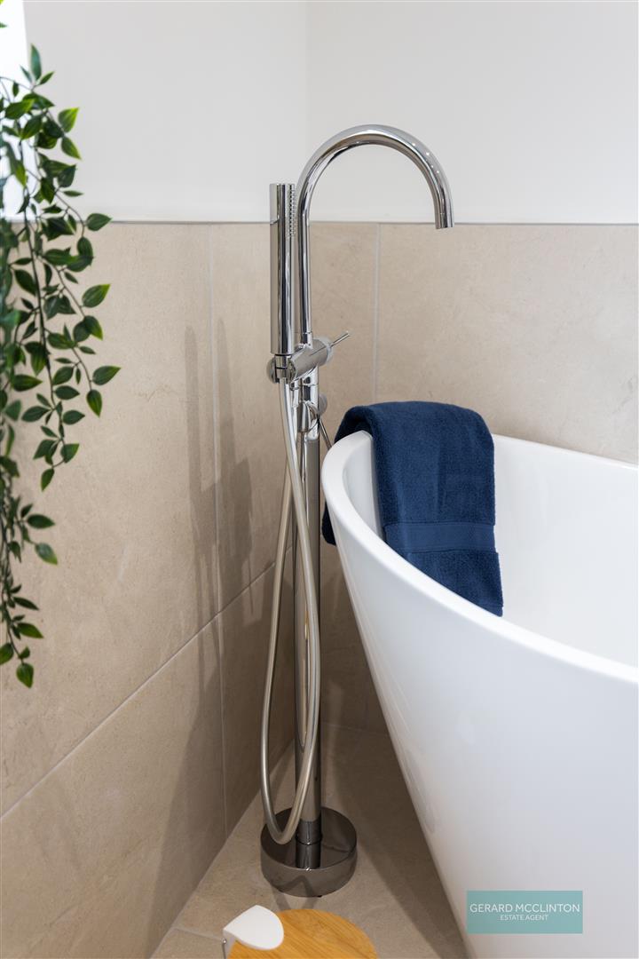 Upstairs, the contemporary bathroom suite feels like something from a boutique hotel, featuring a freestanding bath and a separate shower cubicle - perfect for long soaks or fast mornings.
