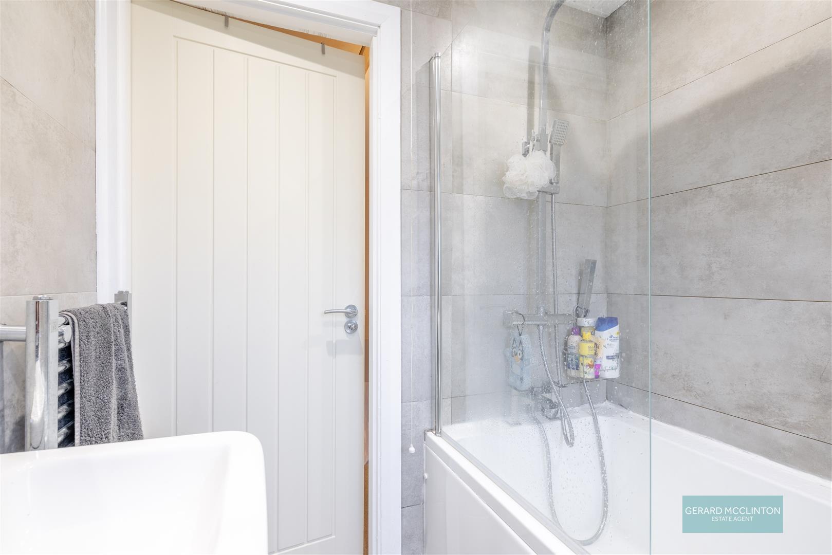 White suite. PVC panelled bath with mixer tap and shower attachment. Pedestal wash hand basin with mono style mixer tap. Close couple low flush wc. Chrome finish heated towel rail. Tiled walls. Tiled floor.