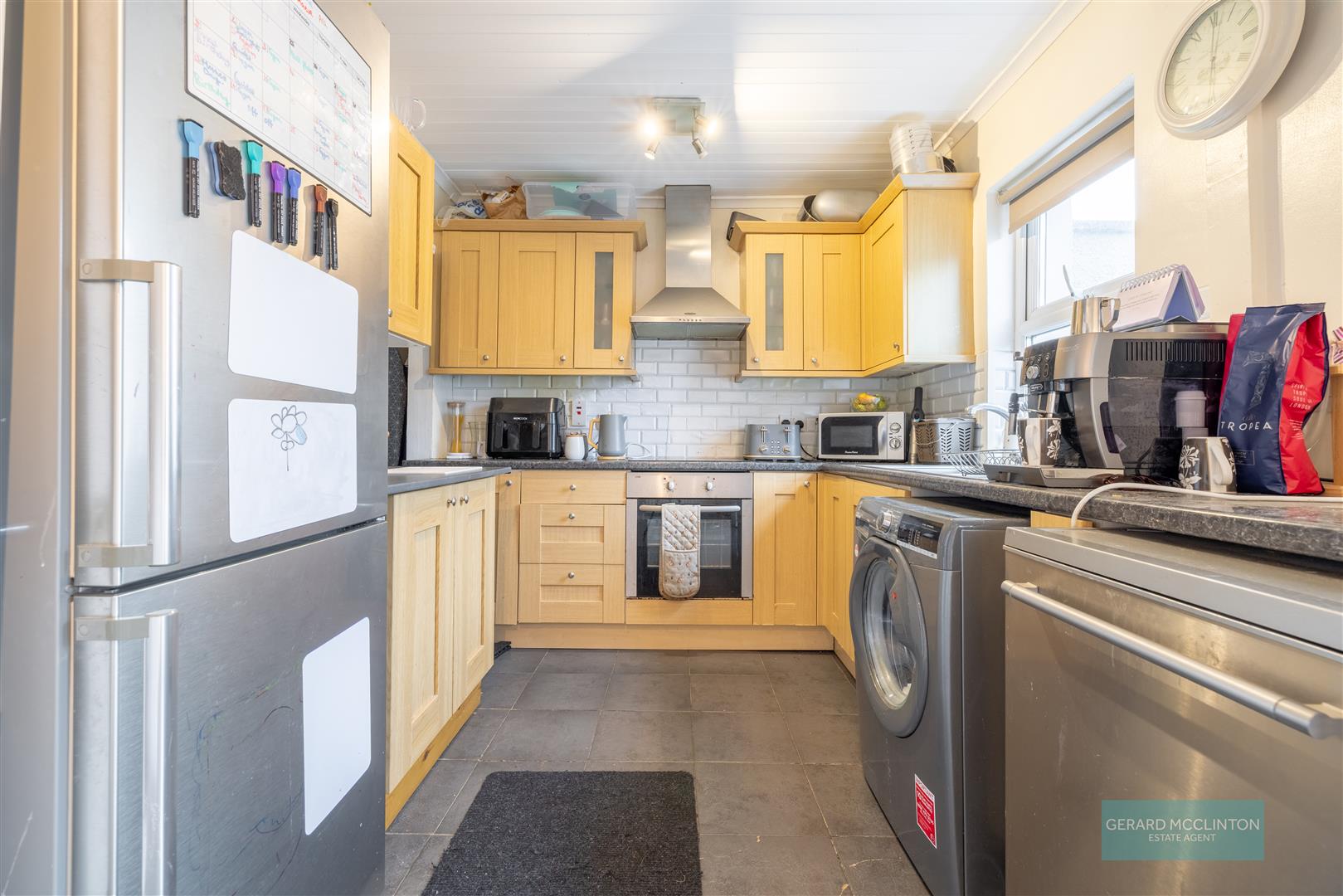 Range of high and low level units. Granite effect polished round edge work surfaces. Integrated oven and hob. Extractor hood in stainless steel canopy. Single drainer bowl and a half stainless steel sink unit with mixer tap. Plumbed for dishwasher. Plumbed for washing machine. Tiled floor. PVC double glazed double doors to Rear. Storage under stairs. gas fired boiler.