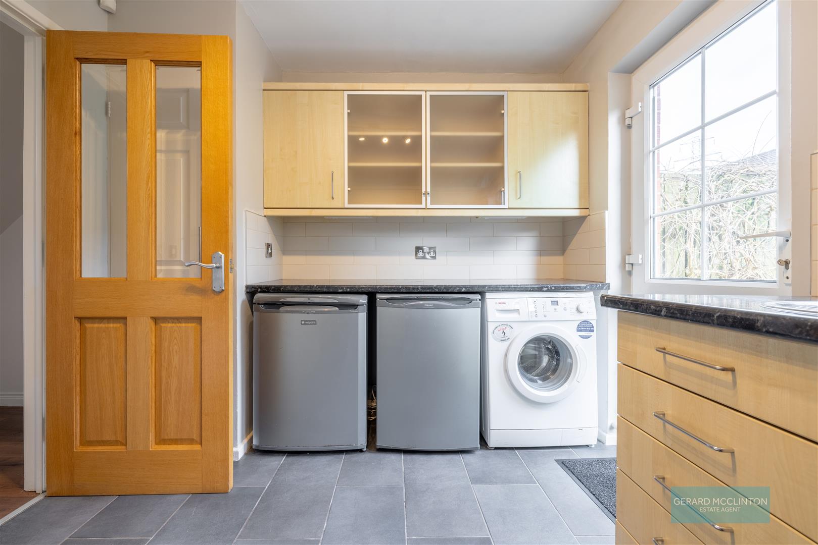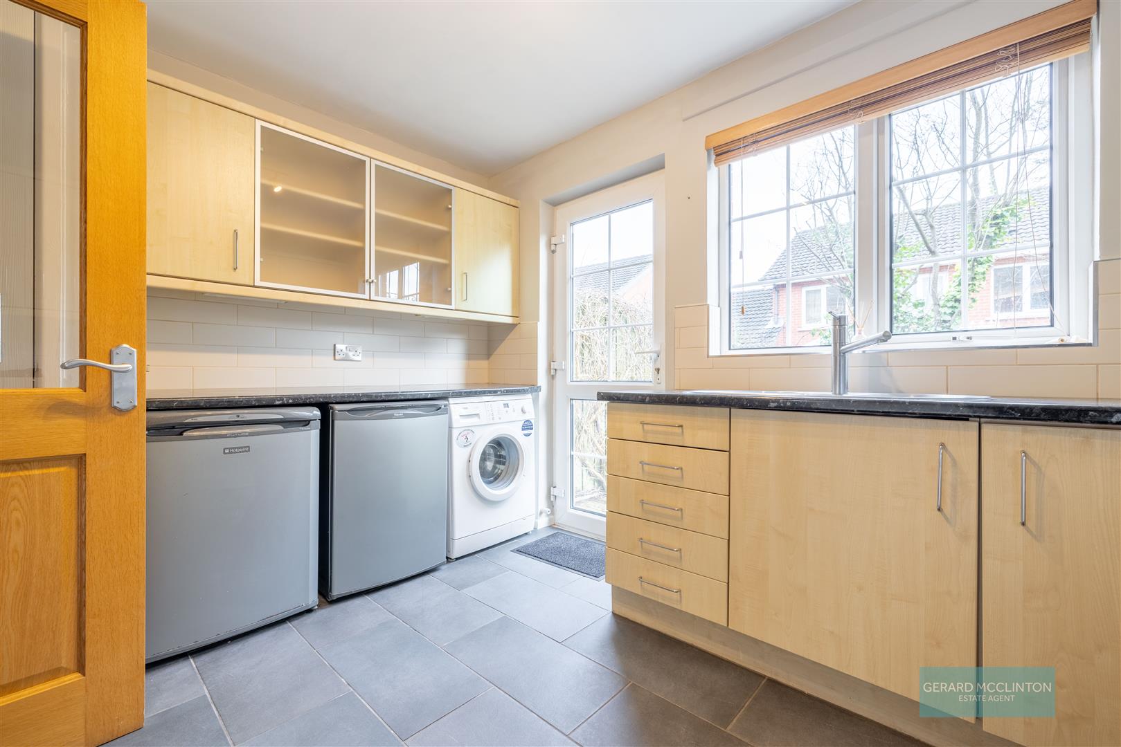 The kitchen is fitted with a range of birch wall and base units, including glazed display cabinets, and offers excellent storage along with space for cooker, washing machine, fridge and separate freezer. A rear door provides direct access to the garden, ideal for summer evenings and family living.