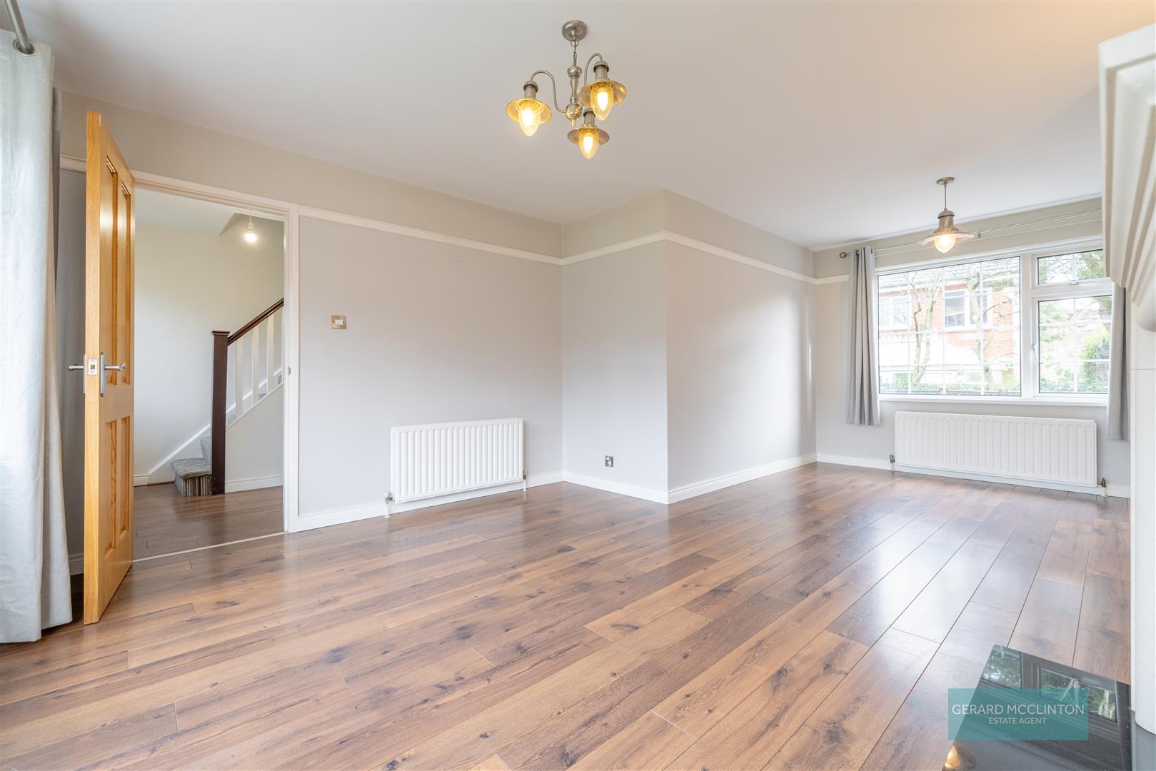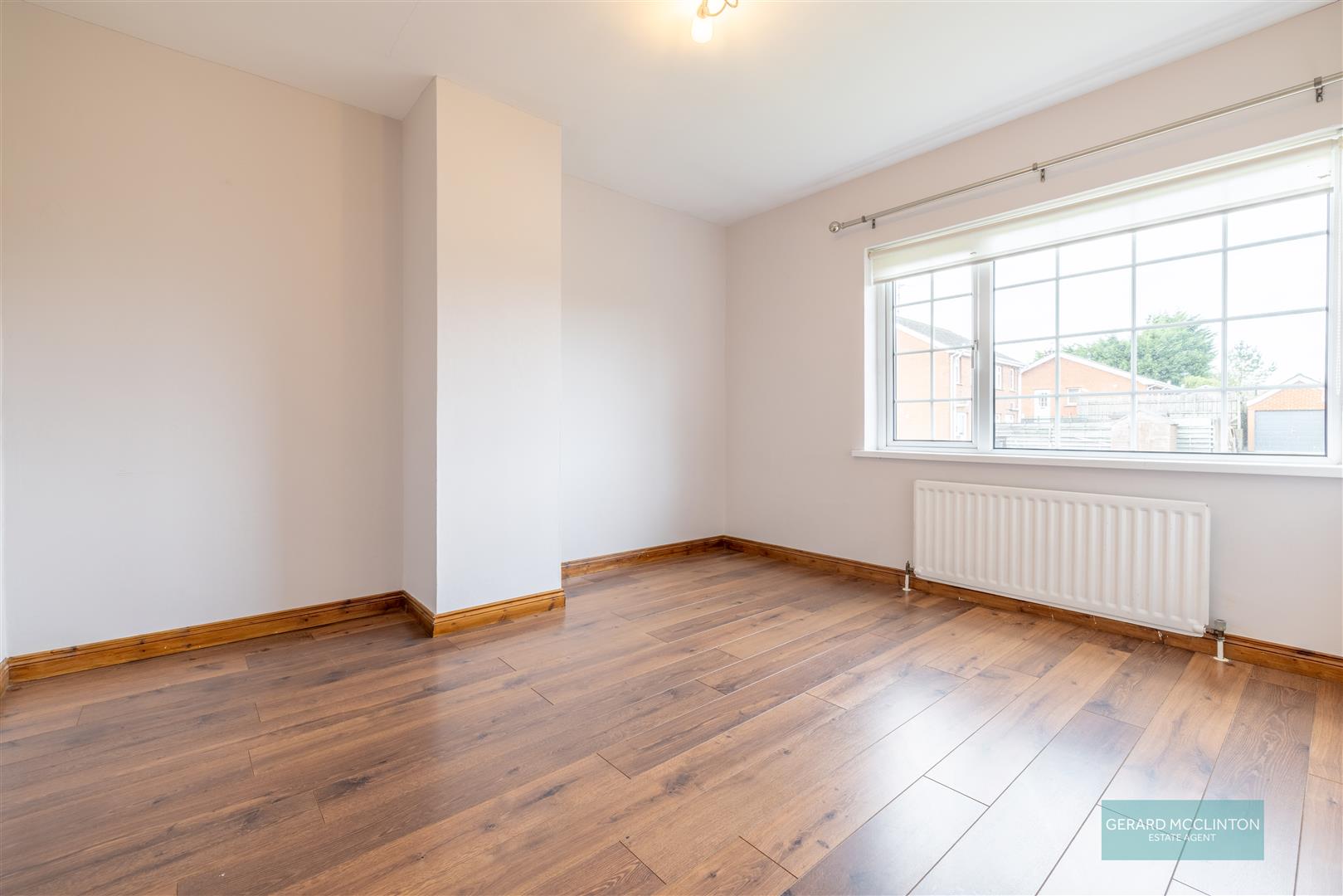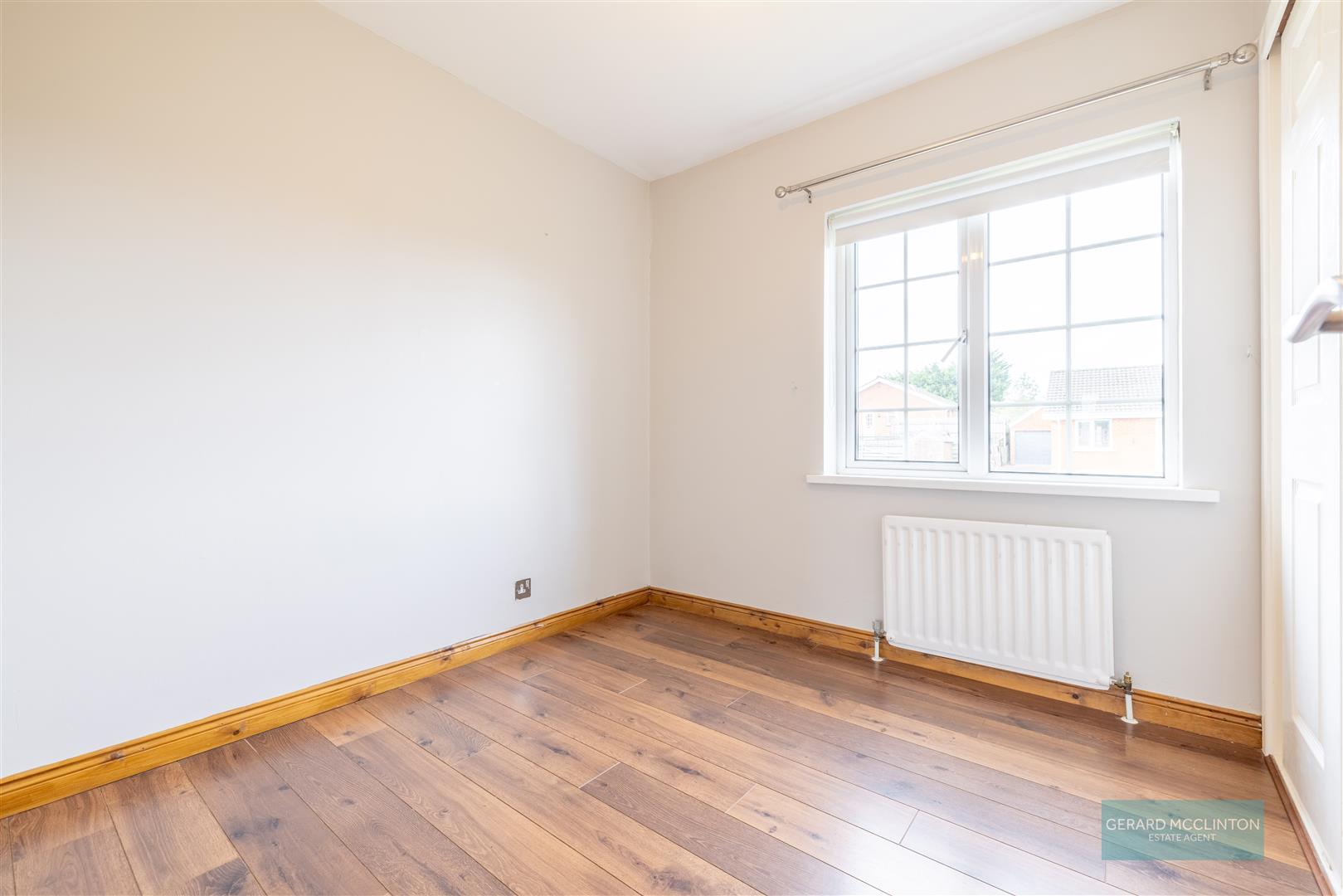 Upvc double glazed window to front, radiator, laminate wooden floor, chrome sockets and switches