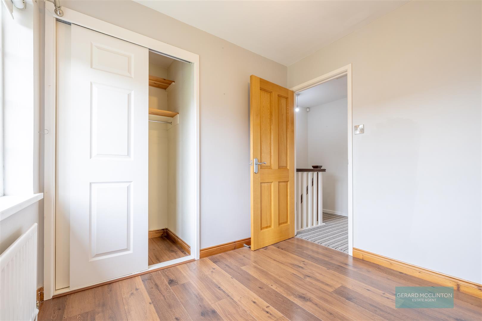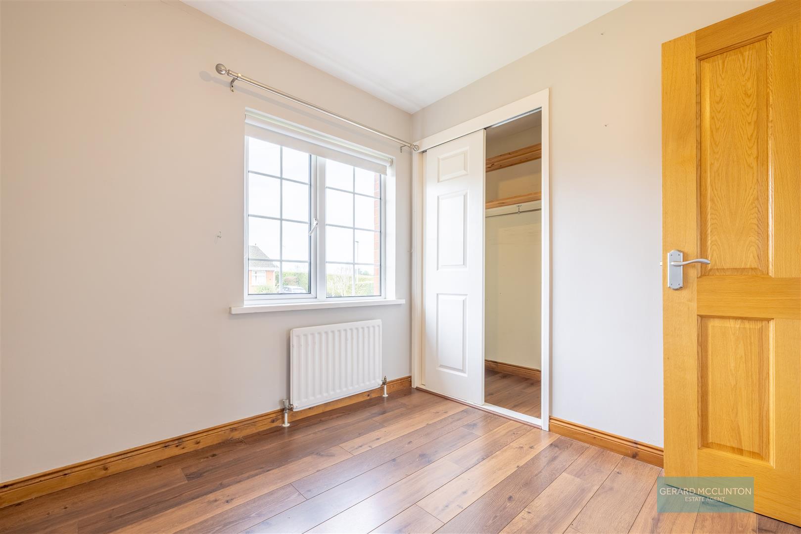 UPVC double glazed window to front, laminate wooden floor, radiator, built in robe with sliding door shelving and rail, chrome sockets and switches